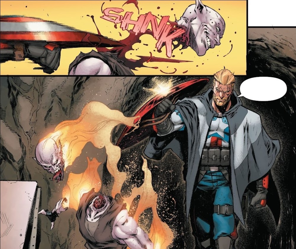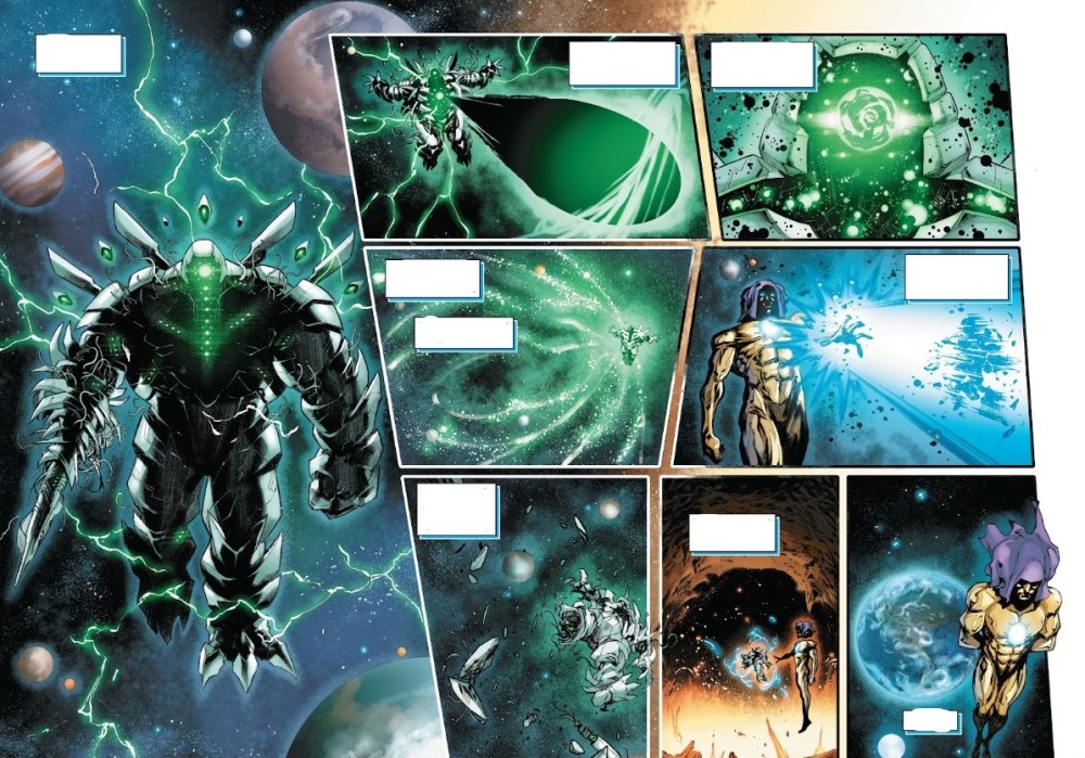 Pero si Taylor diseña, Iban Coello te fulmina con su arte. Este cómic es suyo tanto como del guionista. El artista español no se limita a ilustrar lo que Taylor escribe. Lo empuja, lo exagera, lo embellece y lo convierte en una superproducción. Coello dibuja la destrucción como si fuera una coreografía, y la calma como si fuera peligro. Hay algo en su trazo que convierte cada página en un espectáculo. Las splash pages podrían perfectamente estar expuestas en cualquier mural de una tienda de comic para atraer al público. Las escenas de acción vibran, literalmente vibran, como si los golpes fueran a salir de la página. Y aun así, cuando Coello baja las revoluciones para mostrar algo íntimo (una mirada, una pérdida, una duda), lo hace con una elegancia que sorprende. Lo mejor es que Coello aquí no está encorsetado. No es un número suelto, ni algo puntual, es toda una miniserie donde puede rediseñar personajes, mostrar escenarios nuevos, imaginar un mundo destruido, pero aún vivo. Y se nota que se lo pasa bomba. Lo notas en cada monstruo ridículamente amenazante, en cada héroe reinventado, en cada pequeño detalle que añade para enriquecer la lectura. El tipo se divierte, y cuando un dibujante se divierte, el lector lo nota a kilómetros. El trabajo del colorista Brian Reber también potencia lo que Coello propone. Colores vivos, contrastes marcados, sombras densas, un equilibrio entre luz y oscuridad que sirve tanto para el tono como para el tema central: un mundo sin electricidad, pero no sin vida.