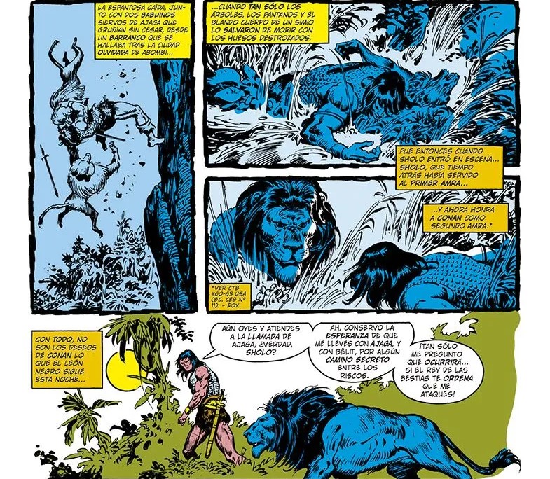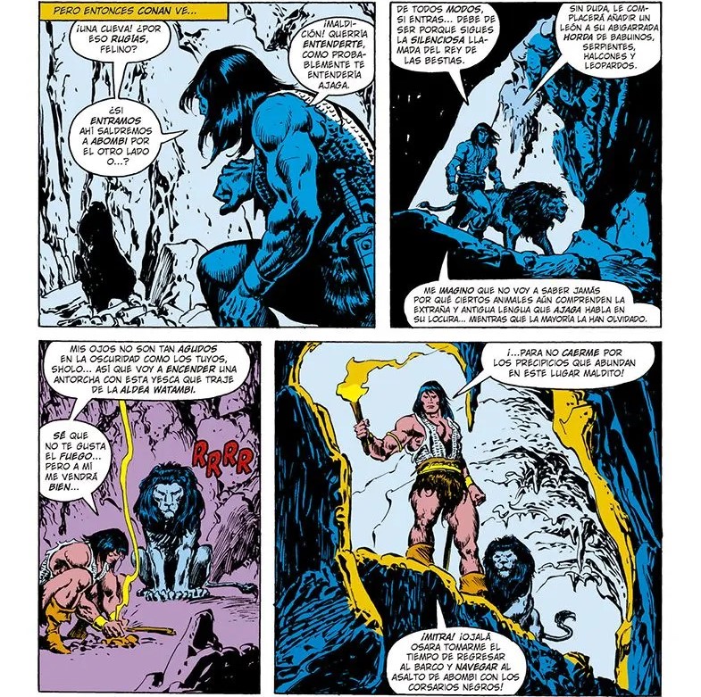 Arrancamos con «The Long Night of Fang and Talon”, donde Thomas despliega su capacidad para construir tramas complejas y llenas de suspense. Conan sigue al león Sholo hacia Abombi para rescatar a Bêlit, capturada por Ajaga, jefe tribal con control sobre los animales gracias al dios Jhebbal Sag. Thomas equilibra estrategia, combate y tensión psicológica, mientras Buscema y Chan ofrecen un despliegue impresionante. La musculatura de Conan, los movimientos felinos de Sholo y la ferocidad de los combates animales-humanos crean escenas que casi saltan de la página. La resolución, con Bêlit liberando a Conan y los animales rebelándose contra Ajaga, combina acción y justicia poética, y muestra a la Tigresa como heroína decisiva.