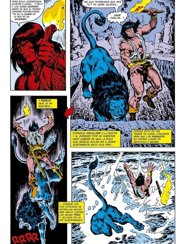 Seguimos con “Devil-Crabs of the Dark Cliffs”. Un relato más tradicional de aventura y horror. Thomas mezcla acción con ingenio: Conan y Bêlit enfrentan a hombres cangrejo inteligentes y letales, mientras idean estrategias para sobrevivir y rescatar a los Argosianos. Buscema vuelve a brillar con escenas de combate espectaculares. Con monstruos aplastados y composiciones que transmiten ritmo, caos y fuerza. La Tigresa, como siempre, lidera y toma decisiones cruciales, mostrando que no es una simple acompañante, sino un personaje de peso narrativo.