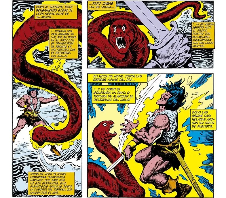 Finalmente, “The Devil Has Many Legs” ofrece un relato de terror clásico. Conan vuelve a la soledad en un mundo cada vez más hostil. Su enfrentamiento con una nueva tribu, así como a un gran monstruo nos sitúan de nuevo en esas aventuras clásica que estábamos acostumbrados. Thomas adapta una historia que nos devuelve en cierta medida a lo anterior y fuera de los grandes océanos. Mientras Buscema con su nivel habitual dibuja la tensión y el horror con su estilo sólido y expresivo, creando una atmósfera inquietante y absorbente.