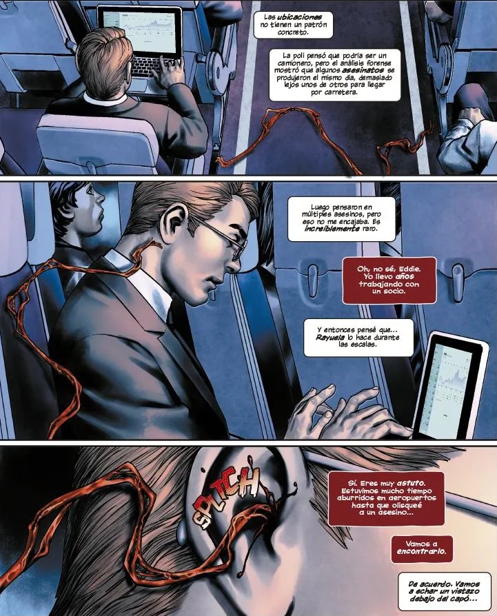 Soule escribe esta historia como si hubiera pasado semanas encerrado en una habitación oscura con el simbionte susurrándole ideas al oído. No hay compasión. No hay redención. Solo un Eddie reconvertido en cazador de asesinos en serie. No por sentido de justicia, sino para calmar a la bestia roja que lleva bajo la piel. Cada investigación que emprende es un chantaje, cada nombre en la lista es un sacrificio ofrecido al monstruo para que no arranque columnas vertebrales al azar. Aun así, percibimos ese temblor en la atmósfera. Matanza quiere más. Siempre más. Los diálogos internos entre ambos son lo mejor del tomo. Suenan como dos voces en un sótano inundado, atrapadas, obligadas a escucharse, odiándose, pero compartiendo una vida. Eddie intenta imponer límites, pero sus pensamientos tiemblan. Matanza responde con una calma homicida, como un depredador que se sabe inevitable. A veces Eddie miente, a veces el simbionte se burla, a veces ambos callan y el silencio pesa más que la sangre derramada. Soule además usa un personaje de lo más armado y nunca mejor dicho para hacer esa contrapartida entre lo viscoso y lo tecnológico.