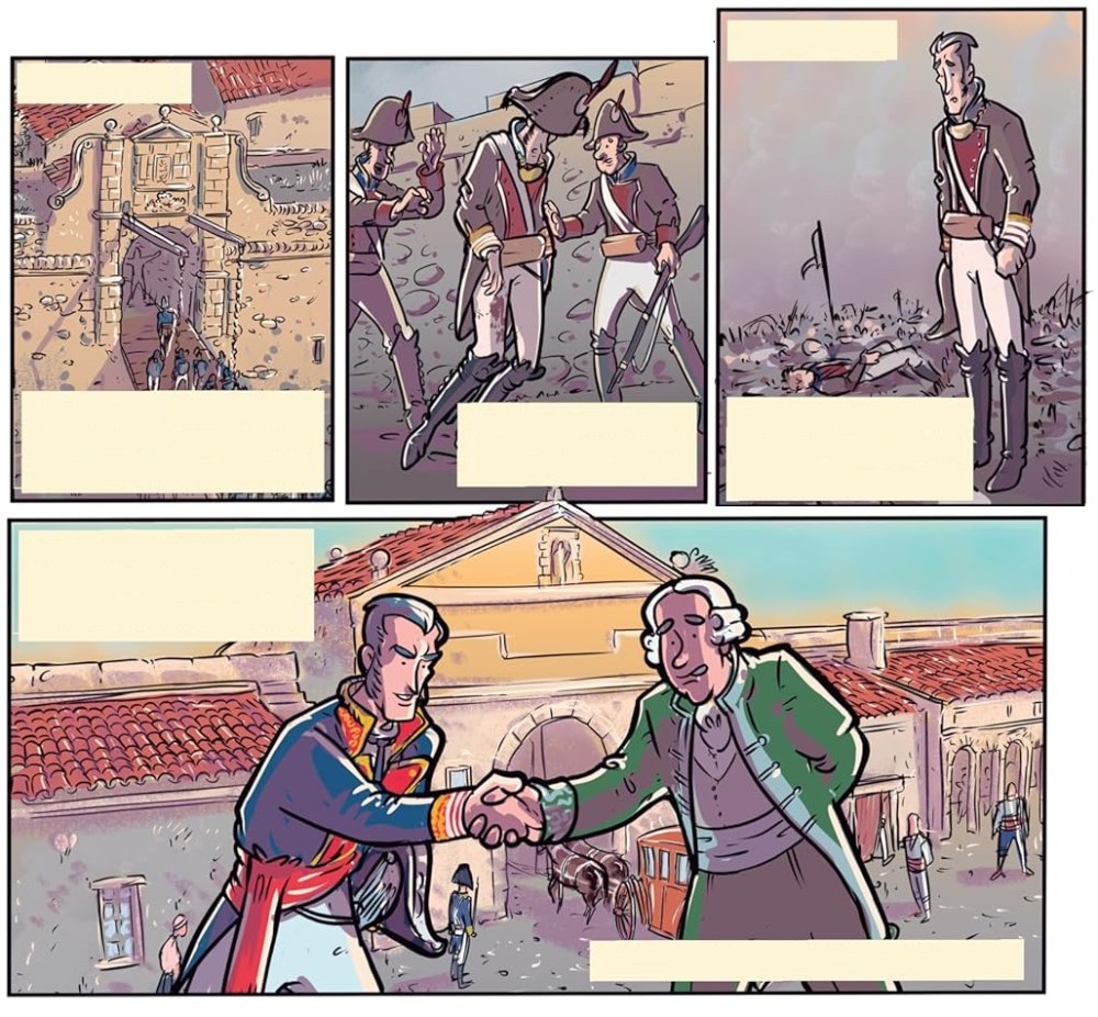 Eso lo cuenta el cómic con la voz de Hilario Giral Laborda (Barbastro, (Huesca), 21-10-1978 – Madrid, 13-12-1865), el capitán de infantería que logró entrar en la Badajoz sitiada y que sirvió de apoyo literal para que un Menacho herido pudiera ir a dirigir personalmente a sus tropas. Ese hecho histórico, que el propio Giral dejó escrito en sus “Recuerdos de los hechos militares durante la Guerra de la Independencia”, sirve a Juan Luis Iglesias para convertirlo en el narrador del cómic, quien desde su Barbastro natal cuenta en una taberna los hechos.