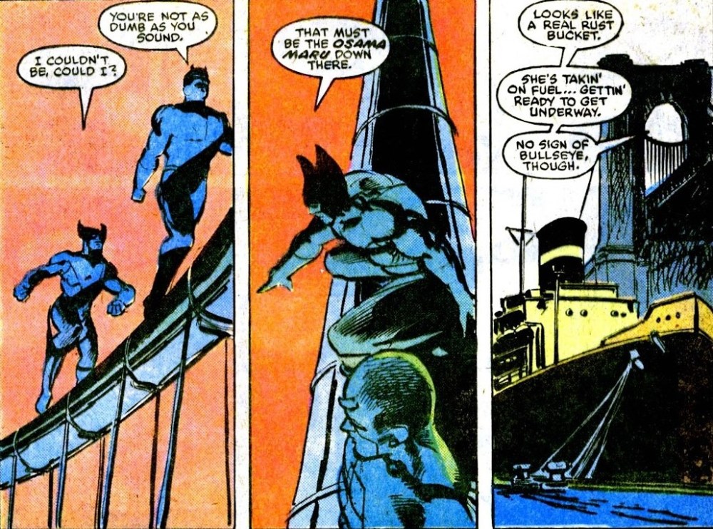 Los primeros números del tomo funcionan como una transición peculiar. Brennert y Hama calientan la máquina mientras Klaus Janson proporciona una continuidad valiosísima tras la marcha de Miller. Pero es a partir del número 194 USA cuando O’Neil toma la batuta por completo y empieza a construir su propio discurso. Uno que apunta a un Daredevil más vulnerable, llevado al límite por errores ajenos y por enemigos que actúan desde rincones más retorcidos de la moral humana. Entonces explotan los dos grandes momentos del tomo. El primero: la saga que devuelve a Bullseye al tablero, con Lobezno como invitado especial y un viaje a Japón que mezcla crimen, honor y ciencia ficción oscura en la operación de adamántium que pretende resucitar al asesino de Elektra. Es una aventura llena de adrenalina, de contrastes entre la brutalidad de Logan y la ética quebrada pero firme de Matt, y de una energía que ya anuncia la llegada del gran protagonista artístico del tomo: David Mazzucchelli.