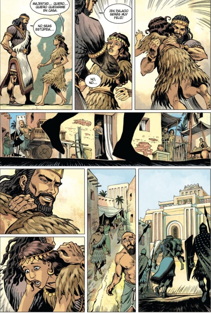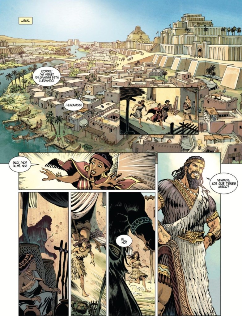 Desde la primera página, la obra impone una presencia monumental. Uruk, la ciudad de las murallas imposibles, es un personaje en sí misma. Un organismo vivo, sofocado por el peso del hombre que la reina, la domina y la despedaza. Porque Gilgamesh no es, al inicio, un héroe. Ni siquiera un villano majestuoso. Es un tirano puro, una tormenta con forma humana. Un rey mitad divino que actúa como un depredador, tomando lo que quiere, humillando lo que toca y ejerciendo el poder como un látigo sin freno. Y la obra no se esconde. No dulcifica nada. Bruneau entiende que antes de convertirse en mito luminoso, Gilgamesh fue oscuridad absoluta. Es ahí donde entra la intervención divina. No como un milagro, sino como un correctivo. Los dioses, hartos del caos del rey, crean un contrapunto, una bestia-hombre llamada Enkidu. Desde el primer momento en que Taranzano lo dibuja emergiendo del desierto, con su fuerza salvaje y su inocencia primitiva, entendemos que no se trata de un simple secundario. Es el espejo que hará temblar al tirano.
