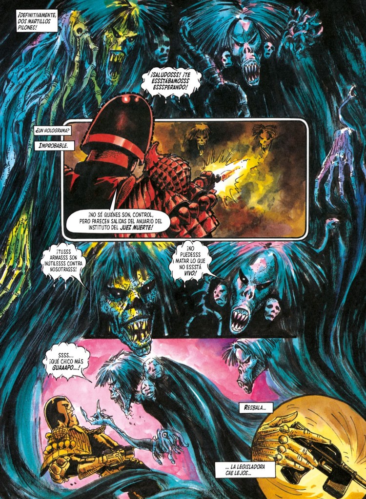 Luego está el arte. El arte, madre mía. La sinfonía esplendida de Ezquerra, apoyada por Simpson y Anderson, funciona como un viaje hacia la locura. Acrílicos que parecen veneno. Sombras que parecen tumores. Figuras que se disuelven en manchas de agonía. Mega-City Uno deja de ser un escenario y se transforma en un cadáver gigantesco, diseccionado viñeta a viñeta. Cada página tiene la textura de una pesadilla húmeda. Cada composición de viñetas es un latigazo, cada secuencia es un zarpazo que deja marca. Si alguien preguntara cuál es el punto más alto del estilo de Ezquerra, habría que entregar este tomo y dejar que responda por sí mismo.