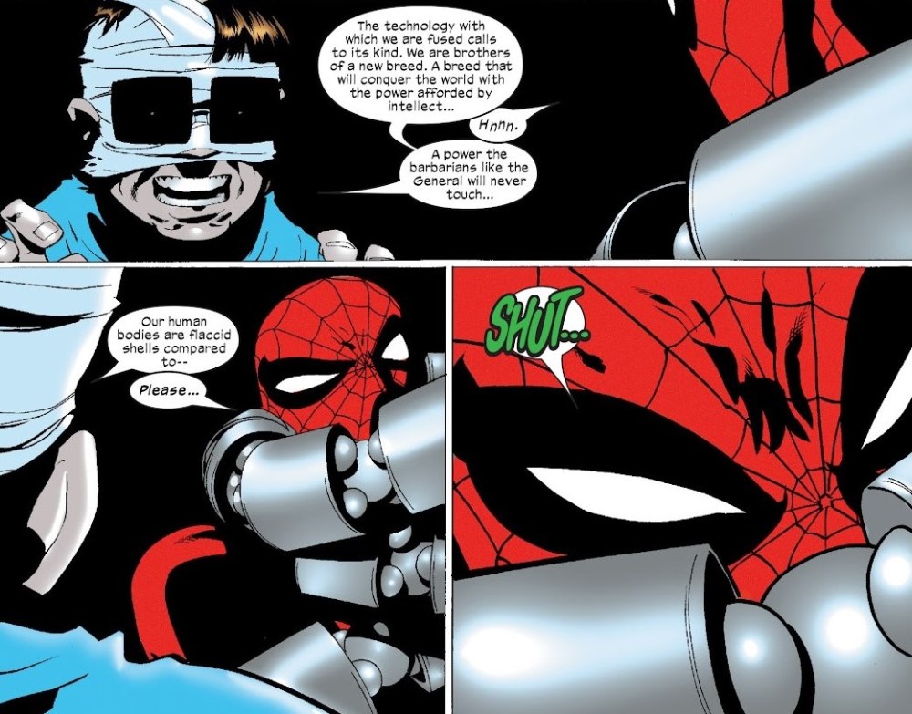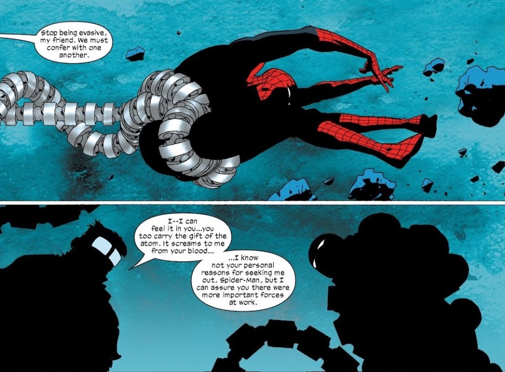 Lo mejor es que Spider-Man apenas aparece. Y es maravilloso que sea así. El título del tomo podría llevar un asterisco gigante: “Spiderman está aquí porque vende, pero esto es una tragedia sobre Otto”. Cuando Peter Parker entra en escena, sirve más como contraste que como protagonista. Él es el joven que también sufrió bullying, que también tuvo pérdidas, pero que encontró una vía hacia la responsabilidad en lugar de hacia la dominación. La simetría entre ambos personajes es tan evidente que asusta. Misma semilla, dos bosques distintos. Donde Peter florece, Otto se incendia. Donde uno abraza el poder como deber, el otro lo acaricia como un arma personal.