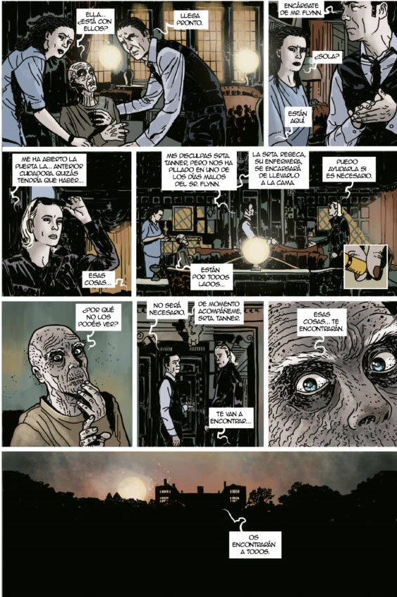 Valentín Ramón es fundamental para que todo esto funcione. Su dibujo es oscuro, sugerente, cargado de una expresividad que refuerza la atmósfera opresiva del relato. El bosque nunca aparece completamente definido; siempre hay sombras, ramas que se cruzan, espacios que podemos rellenar con la imaginación. Las viñetas transmiten una sensación constante de vigilancia, como si algo estuviera observando desde fuera del encuadre. Las mansiones y espacios interiores, por su parte, se muestran fríos, casi muertos, reforzando la idea de que la mansión es un lugar habitado por fantasmas del pasado. El ritmo acompaña a la perfección el tono del guion. Hay páginas que invitan a detenerse, a observar, a leer despacio. No es un cómic para devorar con prisas. Estas páginas exigen atención. Cada silencio, cada mirada, cada viñeta suma capas de inquietud.
