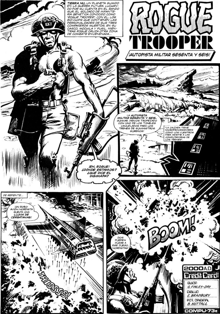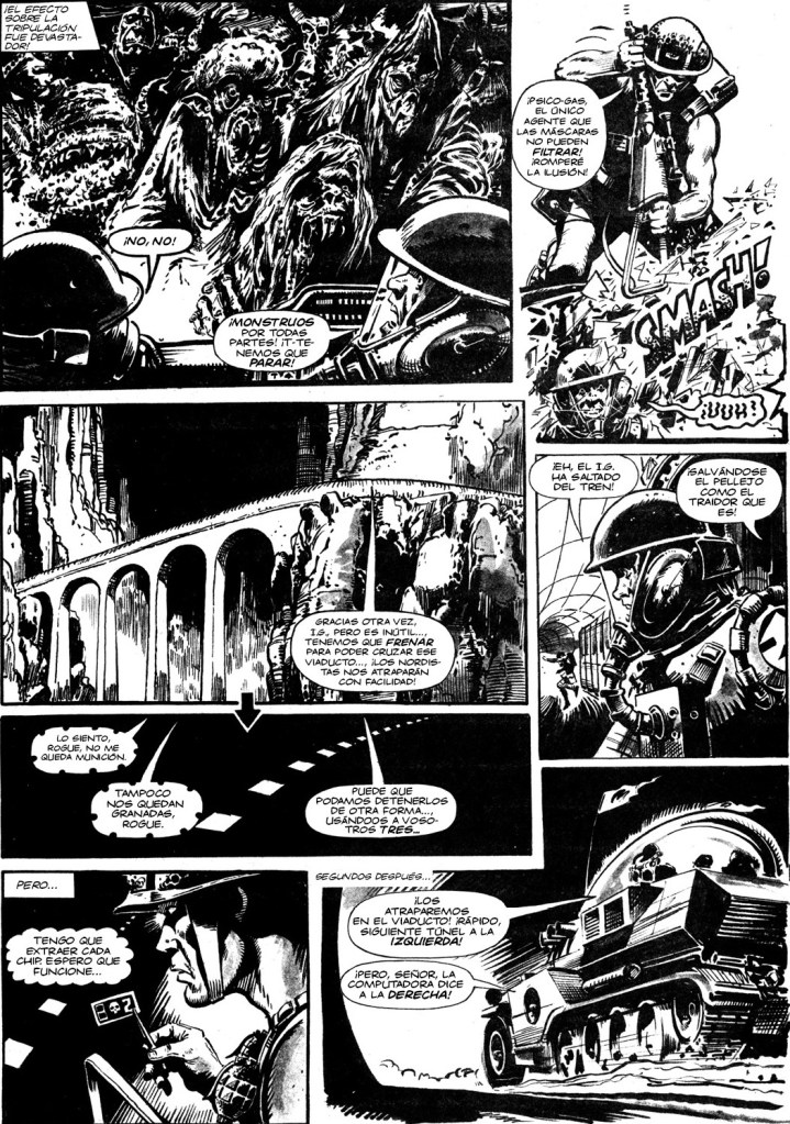 El primer gran arco, Merodeadores (“Marauders”), hace del personaje su versión más reconocible y feroz. Una historia más larga de lo habitual, donde el relato gana peso, densidad y relevancia dentro de la saga. Aquí, por fin, el lector siente que está acercándose al corazón del asunto. El General traidor deja de ser solo un nombre maldito y empieza a convertirse en una presencia concreta, cercana, peligrosa. Finley-Day construye la tensión con pulso firme, y lo hace apoyado en un dibujo que no se anda con florituras. Porque visualmente este tomo es un festival de blanco y negro salvaje. Cam Kennedy, acompañado por Brett Ewins, Eric Bradbury, Colin Wilson y Boluda convierte cada página en un campo de batalla. No hay épica glorificada ni poses heroicas innecesarias. Rogue es una figura implacable, casi inhumana, que se mueve entre explosiones, barro y cadáveres con la naturalidad de quien no conoce otra vida. El trazo es duro, expresivo, a veces casi sucio, y encaja perfectamente con una historia donde la guerra no es una aventura, sino una condena.