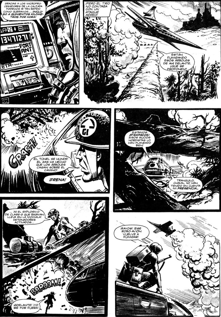 Entonces llega Fuerte Neuro (“Fort Neuro”), y el cómic da un giro que nadie ve venir. Rogue aterriza en una Europa fragmentada, casi anestesiada frente a la guerra global. Un lugar donde la gente vive, baila y se enamora mientras el mundo se desintegra a su alrededor. Escrita en los años 80, esta historia resulta hoy inquietantemente actual, y Finley-Day decide atacarla desde la sátira y el humor negro. El resultado es una de las aventuras más extrañas y memorables del personaje. Aquí vemos a un Rogue desconcertado, fuera de lugar, enfrentado a algo que no puede dispararse fácilmente: la indiferencia. Pasan cosas tan improbables como ver al soldado azul bailar o ligar, momentos de comedia que, lejos de ridiculizarlo, lo humanizan. Cam Kennedy se suelta la melena y juega con la exageración, la caricatura y la comedia, sin romper nunca la coherencia del personaje. Fort Neuro demuestra que Rogue Trooper puede cambiar de tono sin perder identidad, algo que muy pocos personajes logran.