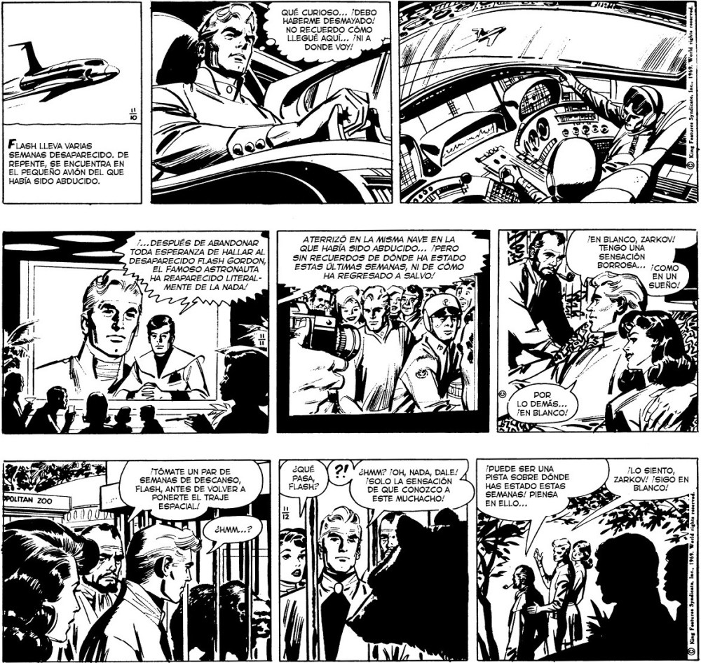 La lectura comienza con una premisa inquietante y muy bien planteada. Flash Gordon lleva varias semanas desaparecido y despierta de repente en el pequeño avión en el que había sido abducido. No recuerda cómo llegó hasta allí ni cuál es su destino. Esa amnesia inicial no es un simple recurso argumental, sino el motor de toda una serie de conflictos que se desarrollarán a lo largo del tomo. Flash ha sido convertido en un peón dentro de un plan cuidadosamente diseñado por el Profesor Dahlmeister, un antagonista que encarna una amenaza más intelectual que física. Sus recuerdos han sido borrados con un objetivo concreto: capturar al Doctor Zarkov. La trampa está tendida en la órbita de la Tierra y, desde ese momento, la serie plantea una tensión constante entre el control de la mente, la manipulación tecnológica y la lucha por recuperar la propia identidad.