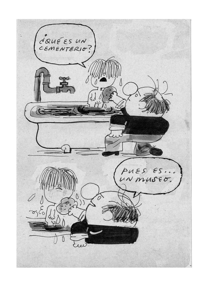 El tono del libro es engañosamente ligero. Hay humor, ingenuidad y referencias a la infancia. A los objetos de siempre, a los tebeos que se leen cuando uno todavía no sabe que algún día va a morir, a los dibujos animados, que parecen acompañar al niño Lorenzo con su espíritu inquisitivo y su capacidad de observar el mundo con una mezcla de ternura y suspicacia. Pero bajo esa apariencia late una reflexión muy seria sobre la conciencia de la muerte. El niño sabe que la muerte existe, pero no la comprende; el fantasma sabe que la vida existe, pero ya no puede alcanzarla. Entre ambos se despliega una melancolía suave, nunca solemne, nunca lacrimógena, que genera una sensación extraña: la de mirar la muerte de frente y, a la vez, aceptarla como parte de un ciclo natural.