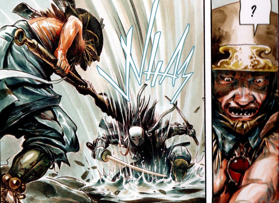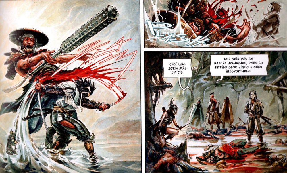 Entonces llegamos al apartado gráfico, que es sencillamente descomunal. Saverio Tenuta se consagra aquí como un auténtico maestro de los lápices. Su uso de la acuarela es hipnótico. Colores terrosos, rojos intensos, negros profundos y mucha sangre. Cada página parece una ilustración cuidadosamente compuesta, pero nunca pierde claridad narrativa. La acción es violenta, directa, casi salvaje, pero al mismo tiempo posee una extraña belleza, una elegancia que transforma el horror en poesía visual. Los combates son uno de los grandes puntos fuertes del tomo. No se limitan a mostrar golpes y espadas chocando, sino que transmiten peso, dolor y consecuencias. Cuando Fudo lucha, lo hace con todo su ser, y eso se refleja en cada trazo. Hay escenas que resultan difíciles de olvidar. Enfrentamientos rodeados de caos, figuras casi espectrales emergiendo entre el humo y la sangre, miradas que dicen más que cualquier diálogo. Tenuta no busca el espectáculo vacío, sino una violencia cargada de significado, casi ritual.