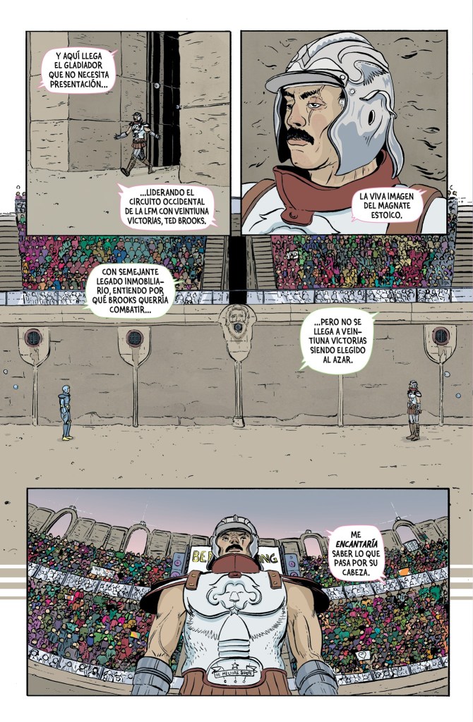La verdadera genialidad del cómic aparece cuando el destino (o el algoritmo) decide que la siguiente combatiente sea Luella Domínguez, exesposa y exsocia de Ted. Aquí Violencia gratuita deja de ser una sátira económica y se convierte en una tragedia íntima. El combate entre ambos no es solo una pelea a muerte. Es el ajuste de cuentas definitivo entre dos personas que creyeron que el amor podía sobrevivir al dinero. Luella no entra en la arena por ambición ni por orgullo; entra arrastrando años de culpa, de decepción y de autoengaño. Ella creyó. Ted acumuló.