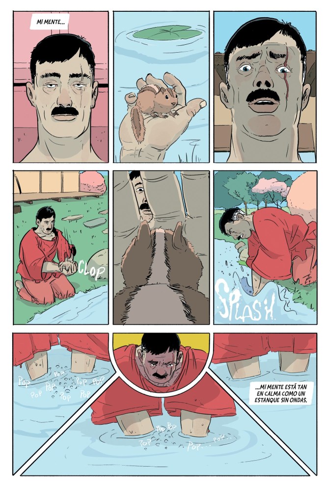 Gráficamente, este tebeo muestra a un Horvath aún en formación, pero ya reconocible. El trazo es más crudo, menos refinado que en Bajo los árboles, donde nadie te ve, pero esa aspereza juega a favor del relato. La violencia no está coreografiada para impresionar, sino para incomodar. Los golpes son torpes, los cuerpos se rompen mal y la sangre no tiene nada de heroico. Hay una escena particularmente perturbadora en la que un cráneo destrozado recuerda inquietantemente a la cabeza de un cerdo, una imagen que anticipa la obsesión posterior del autor por animalizar al ser humano cuando se quita el disfraz de civilización.