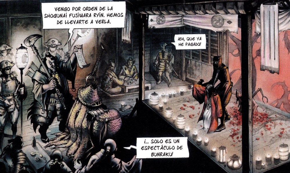 La estructura del relato refuerza esta sensación de desorientación. El tiempo no es lineal. Los acontecimientos se fragmentan, se repiten desde otros ángulos, se adelantan o retroceden sin previo aviso. La narración funciona casi como una obra teatral, donde escenas y símbolos se suceden con una lógica más emocional que racional. El bunraku no es solo un elemento del argumento, sino una metáfora constante. Los personajes parecen marionetas movidas por hilos invisibles, atrapadas en un destino que apenas pueden cuestionar. Esta elección hace que la lectura sea lenta y exigente. No es un cómic para leer de una sentada, ni para consumir de forma distraída. Cada página pide atención, cada escena requiere ser observada con cuidado. La falta de antecedentes y explicaciones puede resultar frustrante para algunos lectores, pero también es lo que da a la obra su personalidad. Aquí no se trata de entenderlo todo de inmediato, sino de dejar que las piezas encajen poco a poco, a veces de forma incompleta, a veces de manera inquietante.