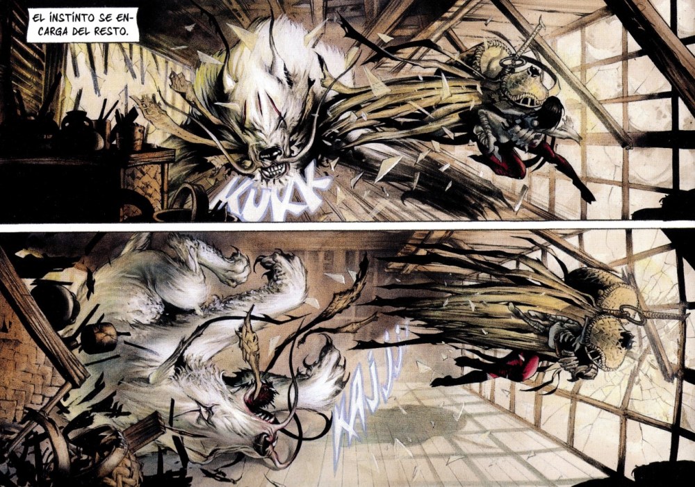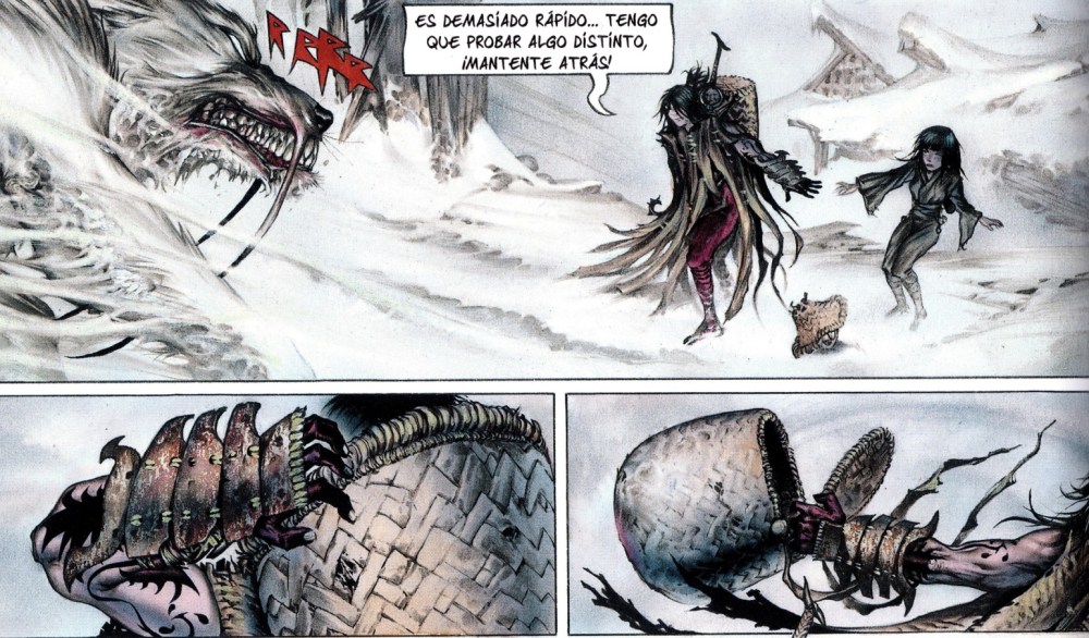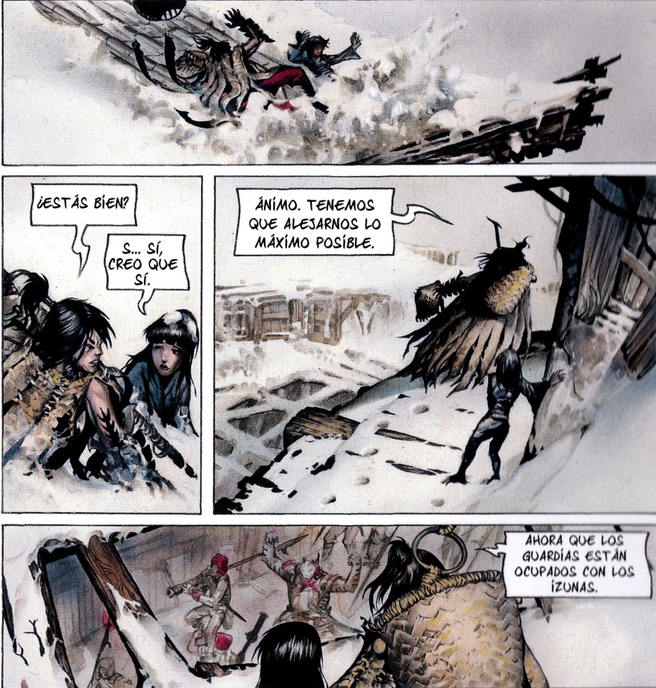 La violencia, cuando aparece, no es espectacular ni gratuita. Es seca, directa, casi ritual. Las espadas cortan sin adornos, la sangre cae y mancha la nieve. Y esa imagen (la blancura transformándose en rojo) se convierte en uno de los símbolos más potentes del tebeo. La pureza inicial se corrompe, el silencio se rompe, el paisaje se vuelve testigo de una tragedia inevitable. No hay heroísmo en estos combates, solo la constatación de que cada enfrentamiento acerca a los personajes a una verdad dolorosa.