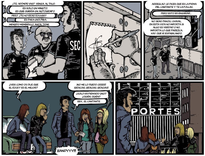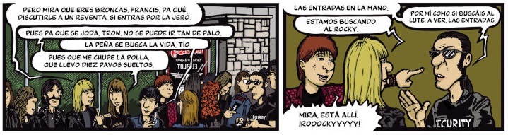 De eso se tejen los “Días de Inmortalidad”, que obviamente tiene mucho de generacional por los códigos estéticos y contexto que maneja. Pero, por lo que cuenta, el tebeo va más allá, pues nos brinda un retrato costumbrista de una época, que permitirá a quien no lo vivió descubrir algunos de los códigos y lugares ya asociados a una época. Como, por ejemplo, aquellas “academias de macarras” que eran los salones recreativos. O los macroconciertos de Heavy Rock donde se constataba que, a pesar del ninguneo de los medios de comunicación serios, era una corriente musical con una gran aceptación. Cosa que, en mayor o menor medida, sigue sucediendo.