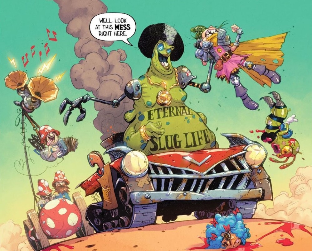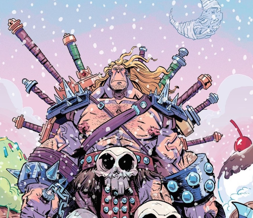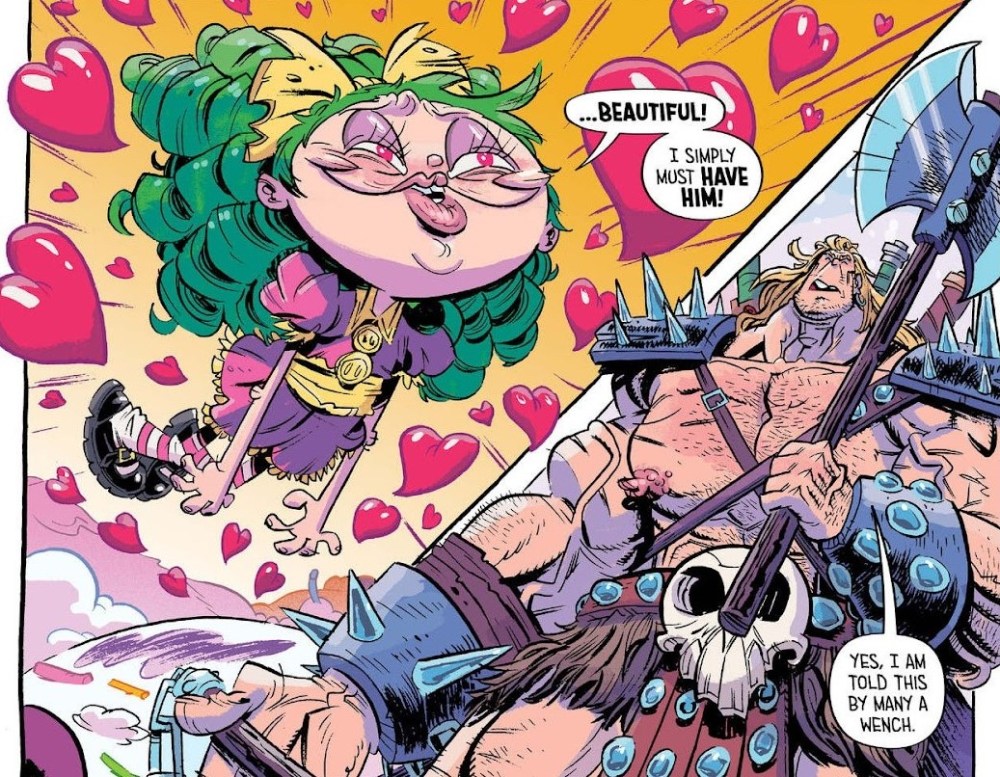 Este tomo es una antología que funciona como una caja de bombas creativas. Cada historia es corta, directa, sin anestesia, y muchas veces más cruel de lo que uno esperaría de un mundo que parece diseñado por un unicornio con sobredosis de azúcar. Pero ahí está la gracia. Fairyland sigue siendo adorable, solo que ahora también es un campo de minas letal y humorístico. Desde el arranque con Brudd El Brutal (“Bruud the Brutal”), Skottie Young vuelve a la carga acompañado de Aaron Conley y Sarah Stern, y deja claro que Gertrude sigue siendo la misma máquina de demolición verbal y física. El combate contra Bruud no es solo una pelea. Es un monólogo cómico en movimiento, una clase magistral de cómo humillar a un bárbaro mientras le rompes la cara. Gertrude comenta, juzga, se burla y ejecuta, todo en el mismo panel. Es glorioso. Es violento. Es Fairyland en estado puro. Y para aquellos que conocimos a cierto príncipe de Eternia estas paginas se mezclaran con nuestra propias lagrimas mientras Gert retuerce pezones como si no hubiera mañana.