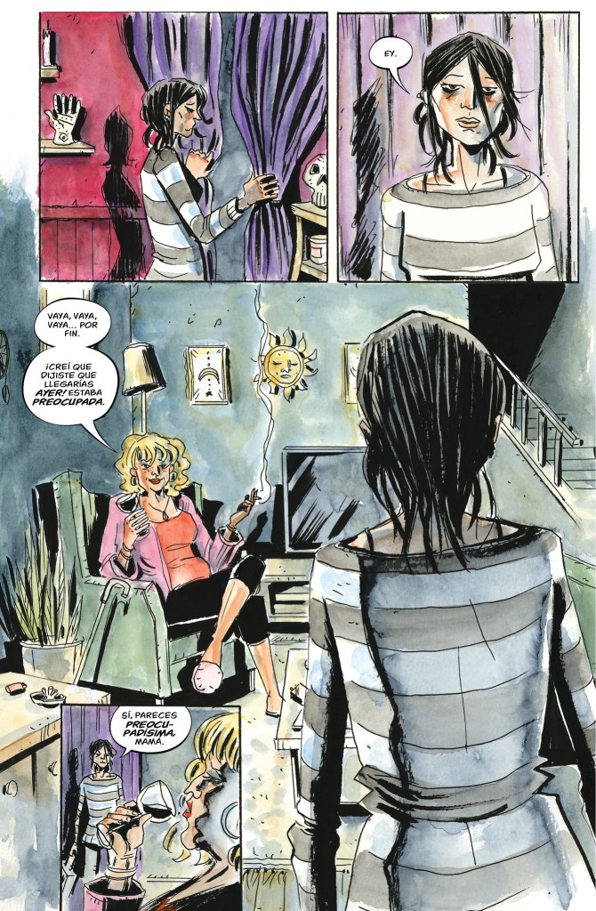 Para ella, ese negocio siempre fue una vergüenza, un símbolo de superstición barata y de una vida que no quería heredar. Sin embargo, como ocurre en las mejores historias de Lemire, nada es exactamente lo que parece. La tienda no es un simple lugar donde se venden horóscopos y falsas esperanzas, sino un auténtico nodo del pueblo. Allí confluyen los vecinos, los vivos y los muertos, las culpas no resueltas y los deseos que nunca se dijeron en voz alta. El tarot se convierte en el idioma secreto de Limberlost, la gramática simbólica con la que se codifican las relaciones humanas. Lemire entiende que las cartas no sirven para predecir el futuro, sino para ordenar el caos del presente. Theresa encarna a la perfección la carta del Loco. La carta del viajero eterno o el impulso creador que avanza sin mapa. Ella es cabezona, arrisca y muy dura de pela. No es una heroína carismática ni una elegida en el sentido clásico, y precisamente por eso resulta tan creíble. Su escepticismo no es pose, es una coraza. Pero el tarot, poco a poco, empieza a resquebrajarla. No porque la convenza, sino porque le ofrece una forma distinta de mirar lo que siempre ha evitado: su madre, su pasado, el pueblo al que juró no volver.