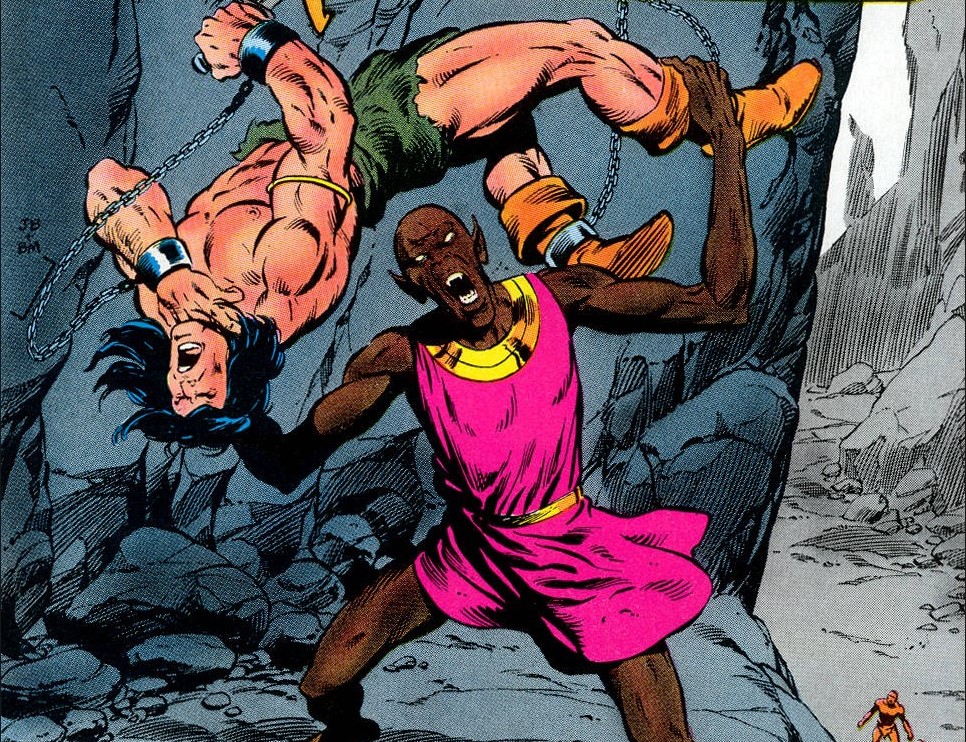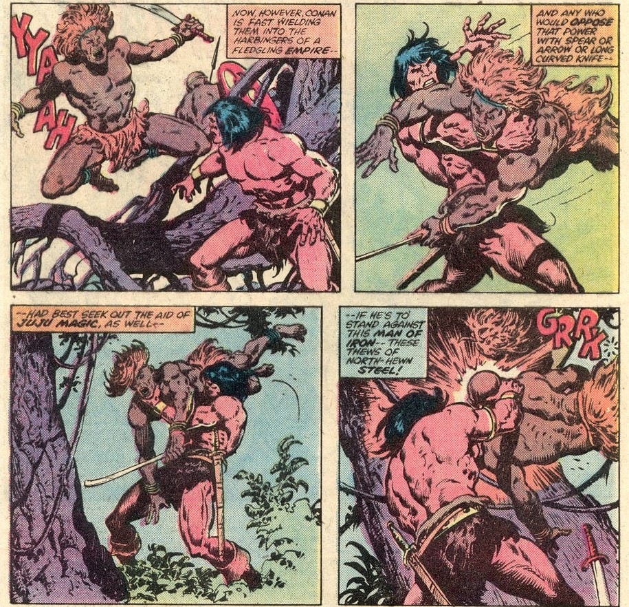 En el aspecto gráfico, hablar del dibujo de John Buscema junto a Ernie Chan en Conan es hablar de la forma definitiva del personaje. Este tomo sin rendirse ante su dibujo sería una blasfemia digna de los dioses más vengativos. Buscema no ilustra el guion. Lo convierte en carne, hueso y acero. Su Conan es el Conan definitivo, el molde del que han bebido todos los demás. Cada músculo tiene peso, cada golpe tiene inercia, cada muerte se siente. Las viñetas no posan: avanzan, atacan, embisten. Buscema domina con una claridad brutal, haciendo que incluso las escenas más caóticas se lean como una danza salvaje perfectamente coreografiada. Los escenarios hyborios, desde aldeas tribales hasta valles malditos, están cargados de una atmósfera opresiva, casi primitiva. No hay fondos vacíos ni lugares neutros: todo parece hostil, vivo, dispuesto a devorarte si bajas la guardia. Y los rostros, esos rostros curtidos por la guerra, el fanatismo o el terror convierten a cada secundario en alguien con historia, aunque solo aparezca durante dos páginas antes de morir de forma violenta.