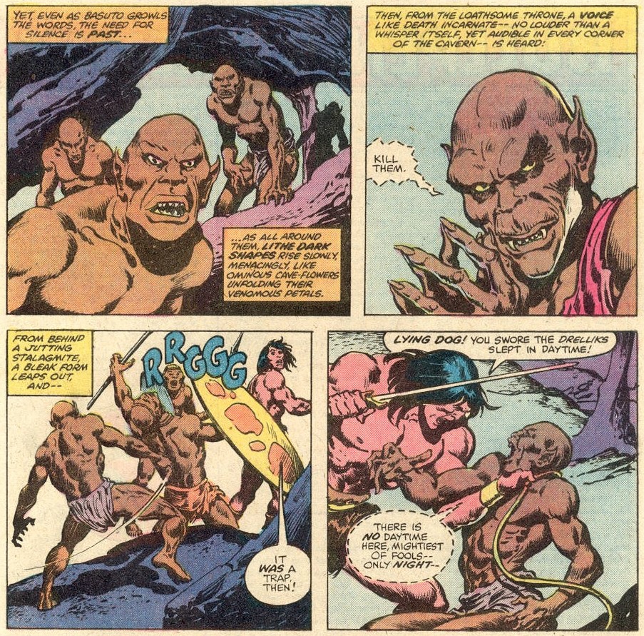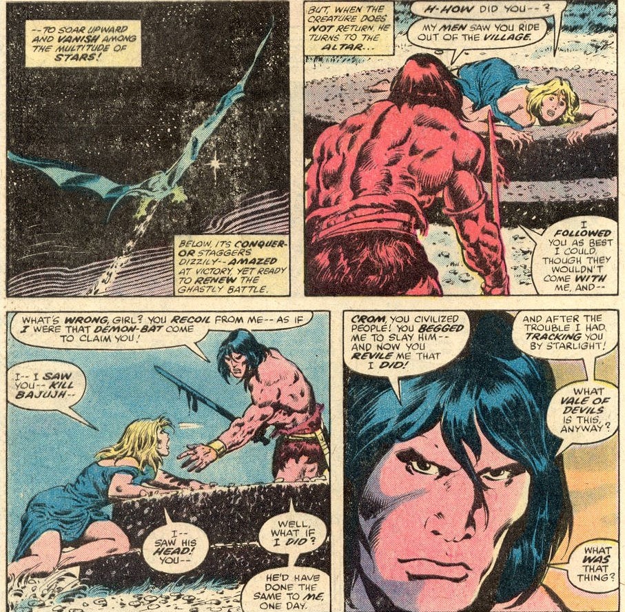 Nos encontramos con un Conan marcado por la pérdida. La muerte de la reina pirata no es un recuerdo lejano ni una herida cerrada. Es una llama oscura que todavía arde bajo su piel. Roy Thomas, en uno de sus momentos más inspirados, entiende que el duelo de un bárbaro no se expresa con lágrimas, sino con acción, conquista y sangre. De ese dolor nace el líder. Conan se alza como jefe de guerra de los bamulas, no por derecho divino ni por linaje, sino porque es el más peligroso de la sala, y en Hyboria eso equivale a ser rey. Ese momento introduce los temas de fantasía más pura con la aparición de vampiros y sectas perversas.