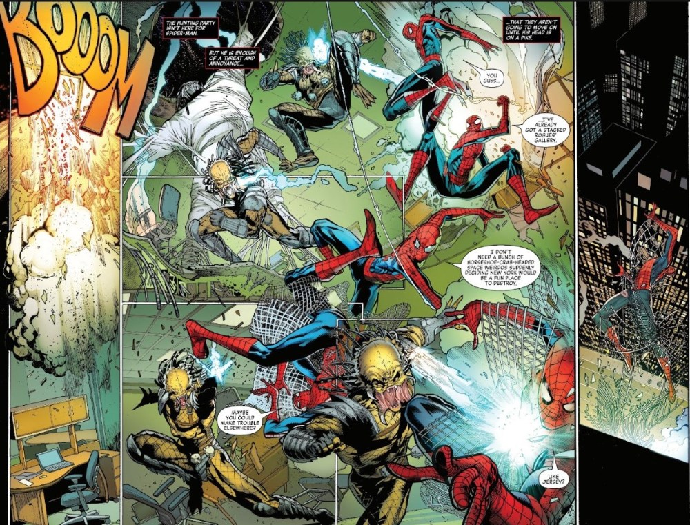 El responsable de la masacre es un Yautja renegado conocido como el Desollador, un Depredador que ha decidido romper cualquier código de honor y entregarse a una cacería urbana especialmente sádica. Esta elección no es casual. Permite justificar una violencia explícita poco habitual en un cómic protagonizado por el trepamuros y eleva el nivel de peligro a cotas muy poco frecuentes en su entorno. El contraste entre el tono habitual de Spiderman y la crudeza de lo que ocurre en pantalla resulta chocante, incluso incómodo, y precisamente por eso funciona tan bien. Percy juega con esa disonancia para reforzar la sensación de que Peter se enfrenta a algo completamente fuera de su zona de confort.
