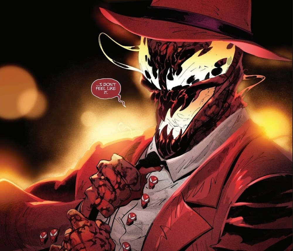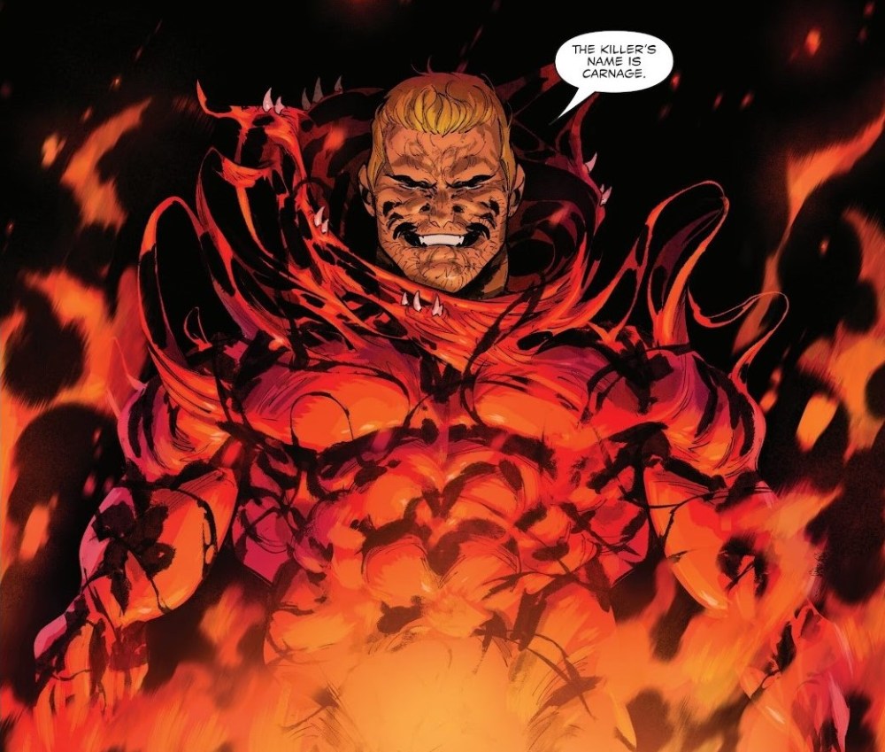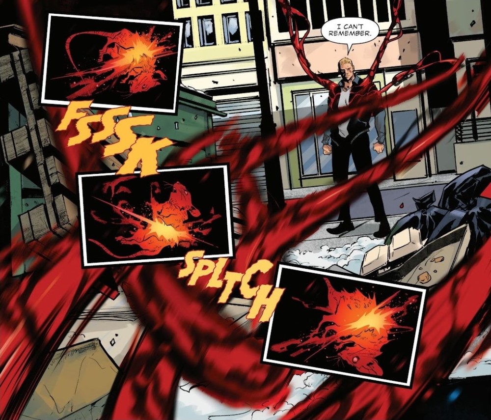 Charles Soule construye este arco desde una idea brutalmente sencilla y cruel. Eddie debe asesinar asesinos para mantener con vida a Matanza y evitar una masacre mayor. No hay victoria posible, solo aplazamiento del desastre. Eddie no es un héroe, ni siquiera un antihéroe carismático. Es un hombre atrapado en un contrato biológico del que no puede salir. Cada muerte que provoca lo acerca un poco más a aquello que juró no ser, y Soule se recrea en esa erosión constante de la identidad. Lo más inquietante del tomo es la evolución de la relación entre Eddie y Matanza. El simbionte ya no es solo una fuerza de destrucción sin rostro; ahora habla, razona, observa. Y, para nuestra sorpresa, empieza a mostrar una forma retorcida de preocupación por su huésped. No porque haya desarrollado conciencia moral, sino porque entiende la lógica de la supervivencia compartida.