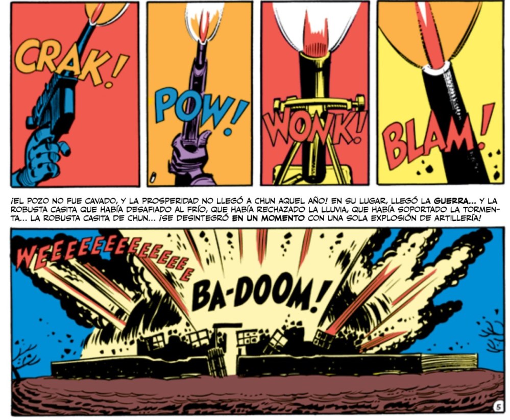 Lo que define a este tomo es su negativa sistemática a glorificar nada. Ni siquiera a las figuras históricas que aparecen en sus páginas. Sitios como El Álamo, personajes como George Washington, el Barón Rojo, el general Custer o los soldados en Corea son tratados con el mismo rigor frío. No hay reverencia automática ni demonización fácil. Kurtzman entiende que la historia se ha contado demasiadas veces desde arriba y decide narrarla desde abajo, desde el punto de vista de quienes cargan con el peso real de las decisiones (vamos de los soldaditos que mueren entre el barro y las balas). En Two-Fisted Tales, la guerra se fragmenta en pequeñas historias humanas. Soldados que obedecen órdenes sin comprenderlas del todo, civiles que quedan atrapados en medio del caos, enemigos que no se diferencian tanto de los protagonistas. Esta insistencia en el detalle cotidiano convierte cada relato en una experiencia íntima, casi claustrofóbica. No se observa la batalla desde lejos: estamos dentro de ella, sintiendo el cansancio, el miedo y la incertidumbre.