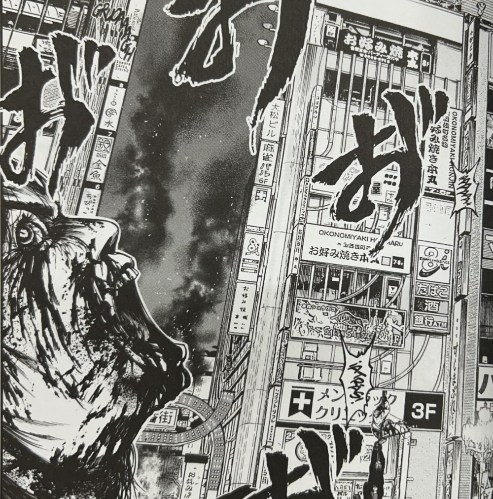 En el aspecto gráfico, el trabajo de Kentaro Sato es demoledor. El blanco y negro no es una elección estética casual, sino una herramienta fundamental. Las sombras se comen a los personajes, los rostros se deforman bajo la presión emocional y los cuerpos parecen siempre a punto de romperse. El trazo es sucio, nervioso, a veces casi caótico, pero nunca gratuito. Aquí el gore no es un adorno, es una consecuencia lógica de un mundo que se ha descompuesto moralmente antes incluso de hacerlo físicamente. Las escenas violentas son explícitas, incómodas y, en ocasiones, difíciles de digerir. Hay sangre, vísceras y cuerpos destrozados, sí, pero lo verdaderamente perturbador es la expresión de los personajes mientras todo eso ocurre. Miradas vacías, sonrisas torcidas, gestos de resignación absoluta. Sato entiende que el verdadero horror no está solo en lo que se ve, sino en lo que se intuye. En ese sentido, el manga juega constantemente con el límite entre lo mostrado y lo sugerido.