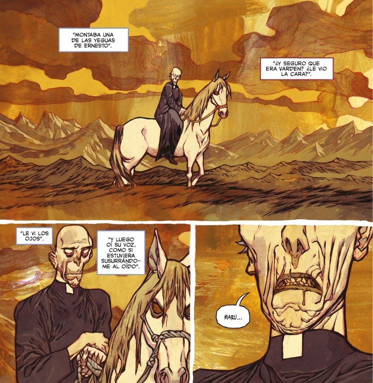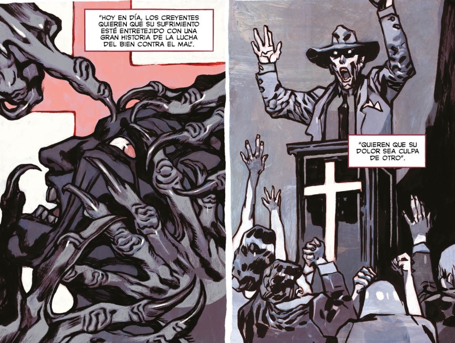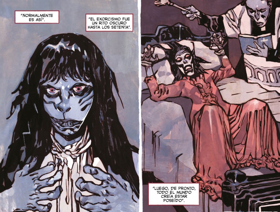 Moreno estructura el cómic según los casos de posesión se suceden y construyen una mitología propia. Sin embargo, el autor evita caer en la repetición o el efectismo. Cada intervención sirve para profundizar en los personajes y en las ideas que atraviesan la obra. El mal no se presenta como una fuerza uniforme, sino como una plaga diversa, cambiante, que adopta distintas formas según la necesidad emocional de quienes lo sufren. La posesión, en este contexto, se convierte en síntoma tanto espiritual como psicológico. Uno de los elementos más inquietantes del cómic es la presencia de una mujer en coma que no ha envejecido en casi medio siglo. Este misterio actúa como un eje silencioso alrededor del cual gira toda la historia. No es solo una anomalía sobrenatural, sino un símbolo poderoso. Un cuerpo suspendido en el tiempo, atrapado entre la vida y la muerte, igual que muchos de los personajes están atrapados entre la fe y la culpa. Moreno dosifica la información con inteligencia, dejando que el lector intuya conexiones antes de explicitarlas, lo que refuerza la sensación de amenaza latente.