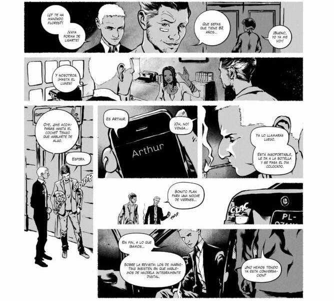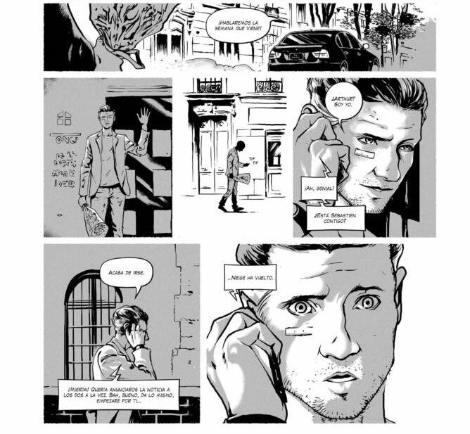 Uno de los grandes aciertos del guion de Lehman es su paciencia narrativa. Aquí no hay prisas por asombrar. La historia se cocina a fuego lento, permitiendo que el lector se instale en la vida de los personajes antes de empujarlos (empujarnos) hacia lo inexplicable. Durante buena parte del tebeo, podría pasar por un relato costumbrista: amistades adultas, divorcios, trabajos que ya no ilusionan, discusiones sobre el paso del tiempo y la sensación de haber dejado cosas importantes atrás. Todo eso es deliberado. Lo fantástico y terrorífico no irrumpe como un golpe de efecto, sino como una grieta que se abre poco a poco en el mundo real. Max es el eje del relato. Escritor, padre divorciado, vinculado a una revista cultural en decadencia y profundamente escéptico ante el mundo digital. Representa a alguien atrapado entre lo que fue y lo que es. No es un héroe, ni siquiera alguien especialmente decidido. Es más bien un testigo, alguien que observa, duda y se resiste. Su punto de vista convierte la historia en algo íntimo, casi confesional, y permite que los elementos sobrenaturales se sientan más inquietantes, porque irrumpen en una vida reconocible, cercana, incluso banal. Arthur y Sébastien funcionan como contrapuntos. Arthur, aventurero marcado por un accidente y por un cuerpo que ya no responde como antes, carga con un pasado físico y emocional que el relato va revelando con sutileza. Sébastien, más frío, más distante, parece haber abrazado una vida adulta funcional, aunque no necesariamente feliz. Entre los tres se construye una dinámica creíble, llena de silencios, reproches no dichos y afecto antiguo. No son personajes idealizados; son adultos cansados, y eso hace que su reacción ante lo imposible resulte tan interesante como irregular.