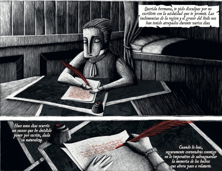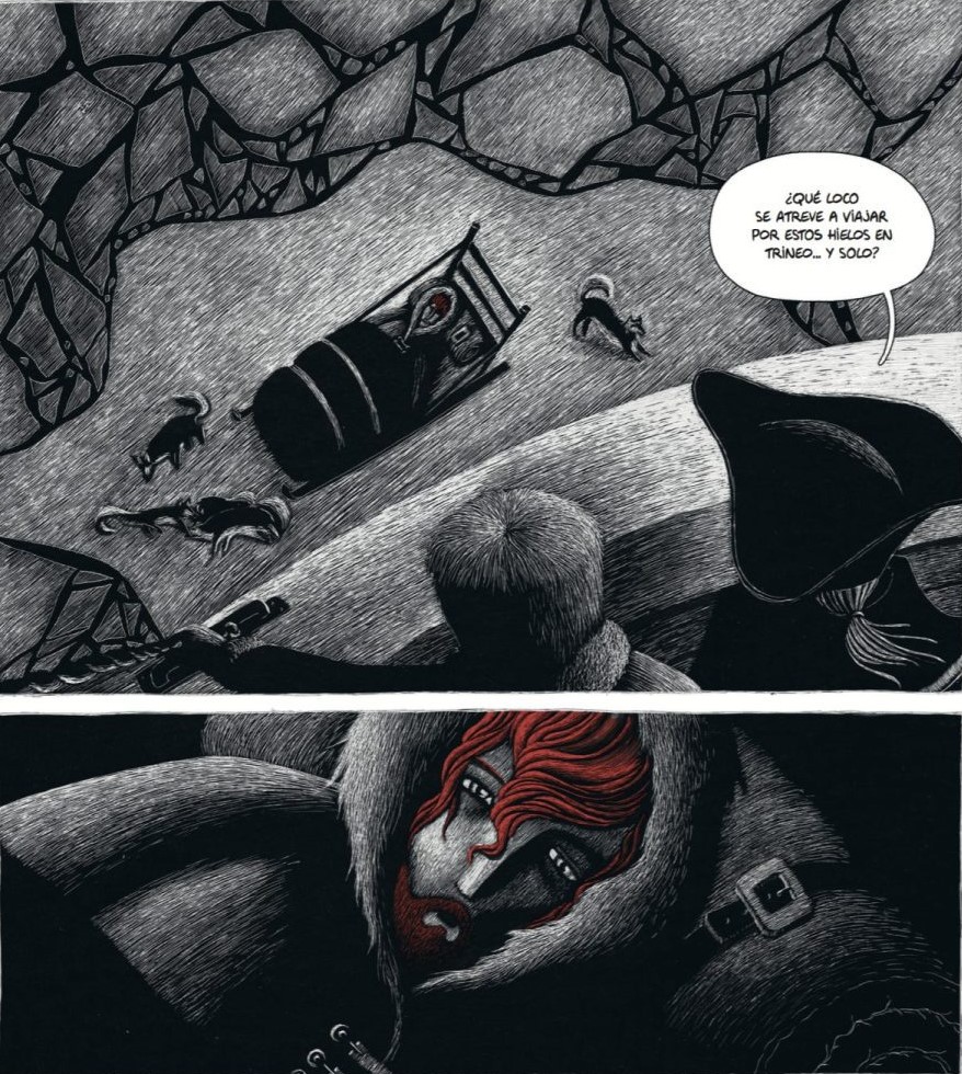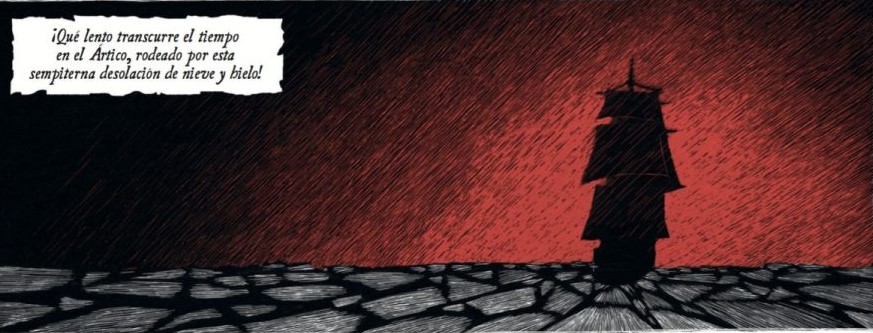 Si el guion establece el tono del relato, el dibujo de Meritxell Ribas Puigmal lo eleva a una dimensión superior. Su trabajo no solo acompaña la historia: la define. Las ilustraciones, realizadas a lápiz componen un universo de una potencia extraordinaria. El blanco y negro domina la obra, interrumpido únicamente por la aparición puntual del rojo, que actúa como una herida abierta más que como un recurso cromático. Ribas no dibuja viñetas al uso. Cada página parece una estampa detenida en el tiempo, una imagen arrancada de un libro antiguo o de una pesadilla decimonónica. Hay en su trazo una densidad orgánica que hace que todo (personajes, paisajes, arquitectura) parezca surgir de la misma materia oscura. Creador y criatura comparten textura y sombras. No hay una separación clara entre lo humano y lo monstruoso, porque la propia imagen se encarga de difuminar esa frontera. El manejo del claroscuro es sencillamente magistral. Las sombras no son un fondo decorativo, sino un elemento esencial. Definen los espacios, modelan los rostros y expresan estados de ánimo. Las montañas heladas, las mansiones silenciosas, los pasillos, el laboratorio donde se gesta la vida, todo adquiere una densidad casi de pesadilla. El frío no es solo ambiental: es emocional. Está en los paisajes, pero también en las miradas, en los gestos contenidos, en la distancia entre los cuerpos. La criatura, en manos de Ribas, es una figura profundamente trágica. No es grotesca ni caricaturesca, sino vulnerable. Más que miedo, provoca compasión. Su recorrido es el de alguien que aprende a amar el mundo observándolo desde fuera, que descubre la belleza, el lenguaje, el deseo de pertenecer. Solo para comprobar que el mundo no tiene un lugar reservado para él. En ese punto, la adaptación conecta de manera directa con el corazón del texto de Shelley: el monstruo no nace, se construye a través del rechazo.