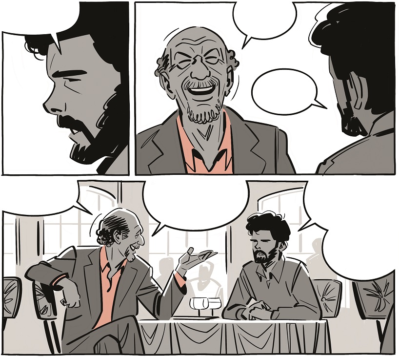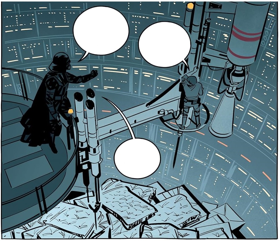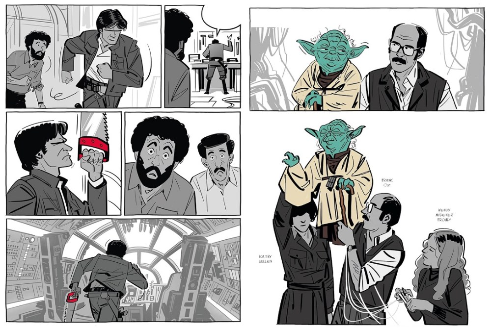 Esas peripecias las vemos en estas páginas, dibujadas con eficacia por Renaud Roche, que vertebra con sus resolutivas páginas este relato de éxito. Dominando el casting del dramatis personae con su hábil trazo, pues todos son reconocibles. Pero no solo como certeros retratos de quienes representas, sino como personajes vivos que se expresan, sienten y padecen, empezando por el propio Lucas y pasando por Irvin Kershneer, Gary Kurtz, Mark Hamill, Harrison Ford, Carrie Fisher, Billy Dee Williams, Anthony Daniels ,David Prowse, Peter Mayhew, Kenny Baker, Alec Guinness, Frank Oz, Robert Watts, Leigh Brackett, Lawrence Kasdan, John Williams, Marcia Lucas y el largo etcétera de personajes implicados en la obra. Todos están vivos en cada viñeta, consiguiendo con ello dar mayor fuerza a lo contado.