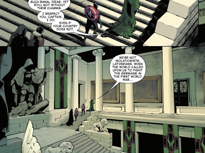Cuando la acción se traslada a Latveria, el tono cambia. Ya no estamos en una persecución urbana, sino en un escenario político y militar cargado de tensión. Doctor Muerte no es presentado solo como un supervillano de manual, sino como un líder con poder real, con un país bajo su control y con una posición en el tablero internacional. El enfrentamiento entre Steve y Víctor, especialmente en el tercer número, es uno de los puntos álgidos del tomo, y lo es precisamente porque no se resuelve a base de golpes. Hay diálogo, hay choque de visiones del mundo, hay una confrontación de egos y de ideas que resulta mucho más interesante que una simple pelea.