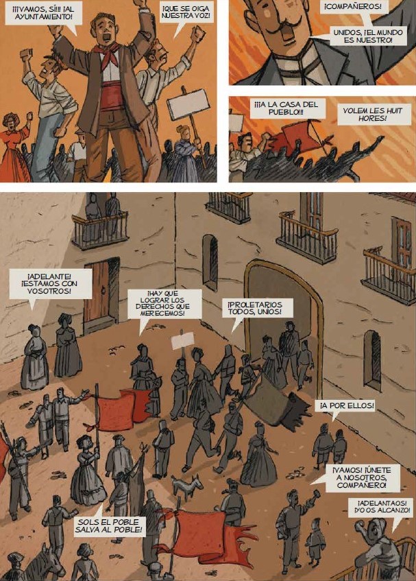 El punto de partida es la llamada “revolución del petróleo” de Alcoy en 1873, un episodio tan decisivo como poco conocido de la historia española. Peidro no lo aborda como quien ilustra un manual de Historia, sino como quien intenta comprender qué fuerzas humanas, sociales y políticas llevan a un pueblo a cruzar una línea sin retorno. La obra no se centra únicamente en el hecho puntual de la revuelta, sino en todo lo que la precede. Las condiciones laborales inhumanas, la desigualdad estructural, la violencia cotidiana y la sensación de que no queda ningún espacio para la negociación. Todo eso se va acumulando página a página, viñeta a viñeta, hasta que el estallido resulta tan inevitable como devastador.