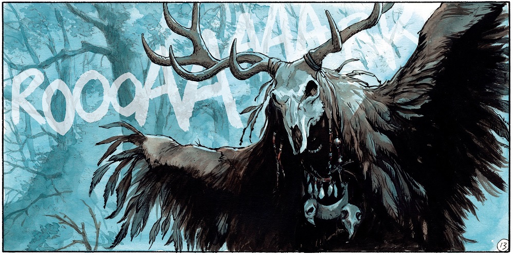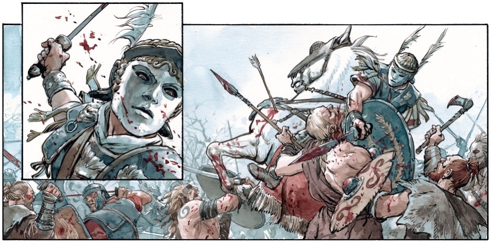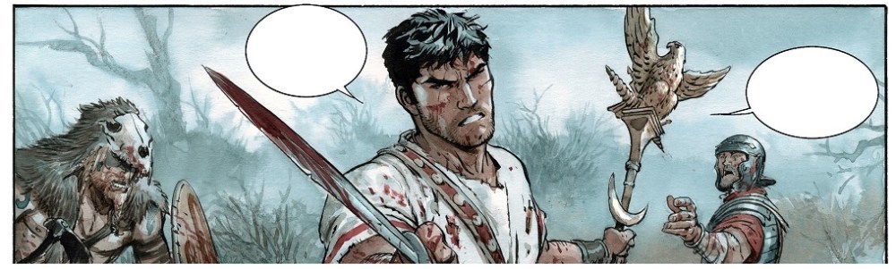 No hay pues, en el recorrido de este cómic, posibilidad de paso atrás. Cada una de las decisiones ha colocado al dramatis personae en una posición irreversible, que Marini aquí muestra, a modo de clímax bélico, las consecuencias que acarrean. Envueltas en épica y drama, el autor definitivamente “cruza el Rubicón” de la saga. Y lo hace con mano y pulso firme, en apenas 56 páginas, traducidas al castellano por Nuria Viver en la edición de Norma, pero con una fortaleza notable. Donde del mismo modo que aprovecha lo simbólico, plasma de forma espectacular y dantesca el fragor de la batalla, el dolor de la humillación de la derrota y la crueldad del vencedor. Sin moralejas y con una crudeza que impacta. En páginas gloriosas que destilan violencia y dolor. También las duras decisiones tomadas en campaña y la audacia de dos jóvenes: uno romano que intenta impedir lo inevitable mientras que el bárbaro romanizado asesta el golpe definitivo a aquellos invasores que humillaron a su pueblo.