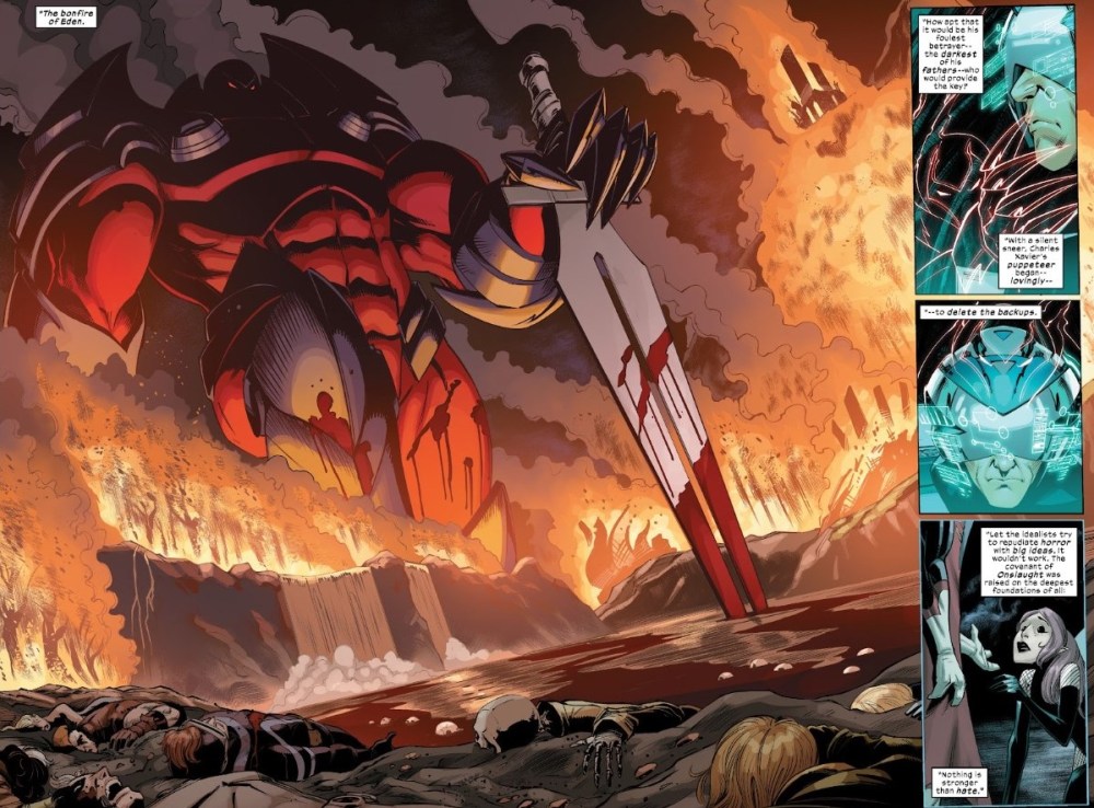 El eje más potente del tomo lo pone Simon Spurrier con The Onslaught Revelation, dibujado por Bob Quinn. Spurrier es uno de esos guionistas que disfruta metiendo a los personajes en conflictos morales y psicológicos más que en simples peleas de superhéroes, y eso se nota desde la primera página. Recuperar a Onslaught podría haber sido un gesto nostálgico o incluso perezoso, otro regreso de villano noventero para provocar un “eh, me suena”. Pero aquí la jugada es distinta. Onslaught no aparece como el gran monstruo final de evento, sino como una infección, un residuo tóxico de la historia mutante, una consecuencia directa de lo que fueron Xavier y Magneto y de lo que todavía representan. La idea es incómoda y muy pertinente para Krakoa. Si el nuevo mundo mutante nace de decisiones moralmente cuestionables, ¿qué clase de sombras arrastra consigo?