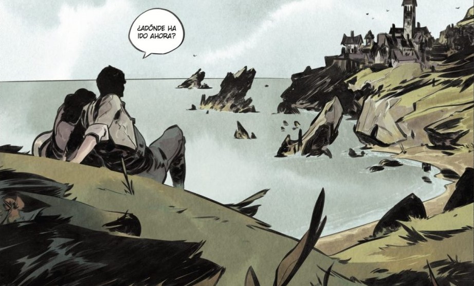 Luego nos encontramos con el dibujo, que es directamente una fiesta para los ojos amantes de lo extraño. Bastide se marca aquí un despliegue de texturas, sombras que hacen que la isla parezca viva. La roca volcánica no es un simple fondo: parece crujir. El mar no es un decorado. Parece dispuesto a tragarse barcos por aburrimiento. Los interiores de Horntown tienen ese aire de lugar donde siempre pasa algo turbio, aunque nadie quiera hablar de ello en voz alta. Y el color, lejos de ser solo bonito, es una guía de emociones que marca peligro y sugiere cuándo estamos más cerca del sueño que de la vigilia. Hay páginas que parecen ilustraciones sacadas de un libro de cuentos prohibidos. Otras recuerdan a grabados antiguos pasados por una pesadilla. Y, de vez en cuando, Bastide te suelta una viñeta tan potente que tienes que parar un segundo y mirarla como quien se queda embobado ante un cuadro en un museo… solo que aquí el cuadro podría morderte.