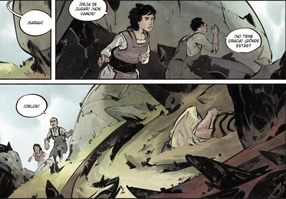 Bastide juega con dos líneas temporales como quien baraja dos mazos de cartas marcadas. Por un lado, el presente de Asiel y su carrera contrarreloj para salvar a Mary. Por otro, el pasado de Sarah, una niña que persiguió un conejo y cayó en algo que no debería existir. Aquí la influencia de Alicia en el país de las maravillas se nota, pero pasada por un filtro gótico, con menos té y más ceniza volcánica. Lo maravilloso es que, pese a su tono oscuro, tiene algo de espíritu aventurero. Es un cómic de exploración: de cuevas, de recuerdos, de culpas y de creencias. Cada nuevo descubrimiento parece una sala más en una mazmorra donde no sabes si al final te espera un tesoro o un dragón. Bastide no te lleva de la mano: te suelta una linterna, te desea suerte y te dice “si escuchas ruidos raros, probablemente es normal”.