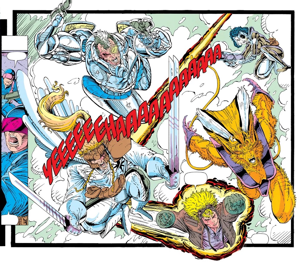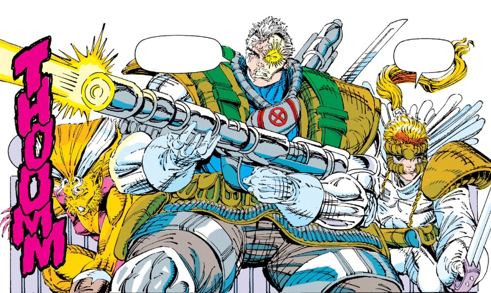 En esta paginas hay un intento de desarrollo psicológico(lo intentan). Nicieza se esfuerza por dar conflicto interno a Bala de Cañón, por mostrar las dudas de Siryn, por sembrar misterio alrededor de Dominó y por apuntalar el pasado enigmático de Cable. Pero el cómic tiene prisa. Siempre tiene prisa. La siguiente splash page está esperando y necesita espacio para que alguien pose con una ametralladora del tamaño de un poste telefónico. La trama aquí es como una cinta de correr a velocidad máxima: si te distraes, te caes. Y luego está el carrusel de enemigos. Dyscordia y el Frente Mutante de Liberación aparecen como amenaza principal, pero pronto la serie adopta la filosofía “¿y si ahora peleamos contra…?”: Arma X Kane, la Hermandad de Mutantes Diabólicos, los Morlocks, Black Tom, Juggernaut, el agente G.W. Bridge, Gideón… Cada arco parece diseñado con la intención de introducir un nuevo adversario con diseño impactante, nombre contundente y capacidad para salir despedido por los aires en la página siguiente. ¿Coherencia global? La justa. ¿Espectáculo? A raudales.