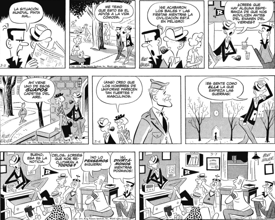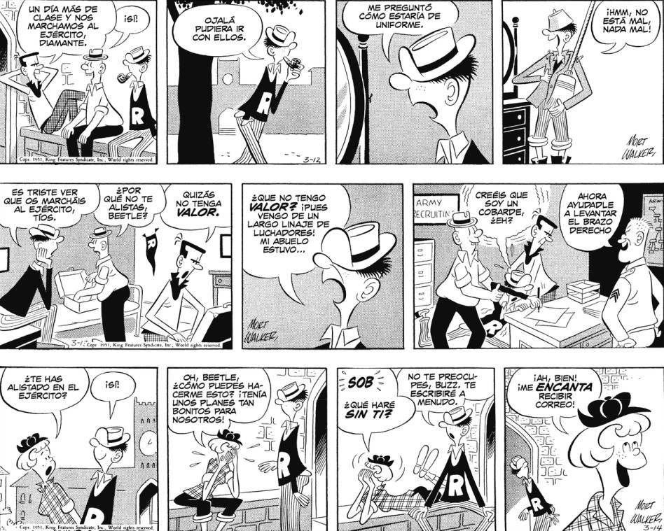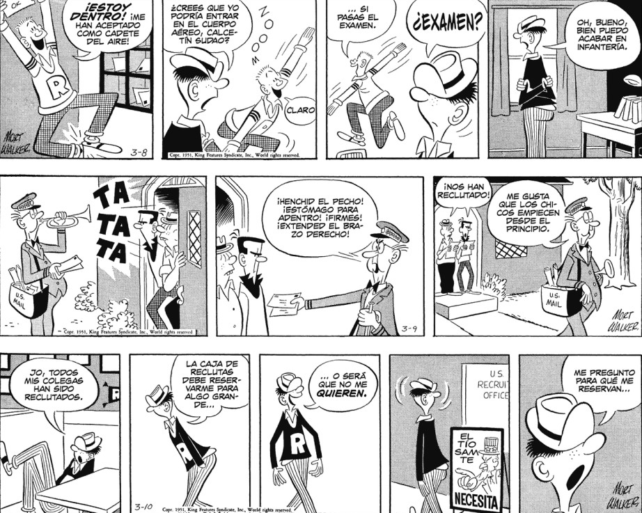 Este tomo convierte lo cotidiano en comedia. Las órdenes, los entrenamientos, los permisos, los regresos al hogar, todo eso que podría ser rutinario se transforma en material de gag. Hay tiras que giran en torno a un simple “tienes que hacer esto” y terminan en un pequeño desastre controlado. Otras juegan con las expectativas. Crees que el soldado Bailey va a portarse bien y, por supuesto, no. Y lo mejor es que nunca cansa, porque Walker sabe variar los enfoques y encontrar siempre un ángulo nuevo para el mismo conflicto básico: deber contra ganas de no hacer nada. El hecho de que la serie vaya a cumplir 75 años hace no solamente que sea una cifra impresionante. Es la prueba de que encontró un filón cómico inagotable. Este volumen recoge una etapa temprana, fresca, con la energía de una idea que todavía está explorando todas sus posibilidades, pero ya con una identidad clarísima. Leer estas tiras es como ver los primeros partidos de un jugador que sabes que va a acabar ganado muchos trofeos. Se nota el talento, ya se nota la seguridad, ya se nota que aquí hay algo especial.