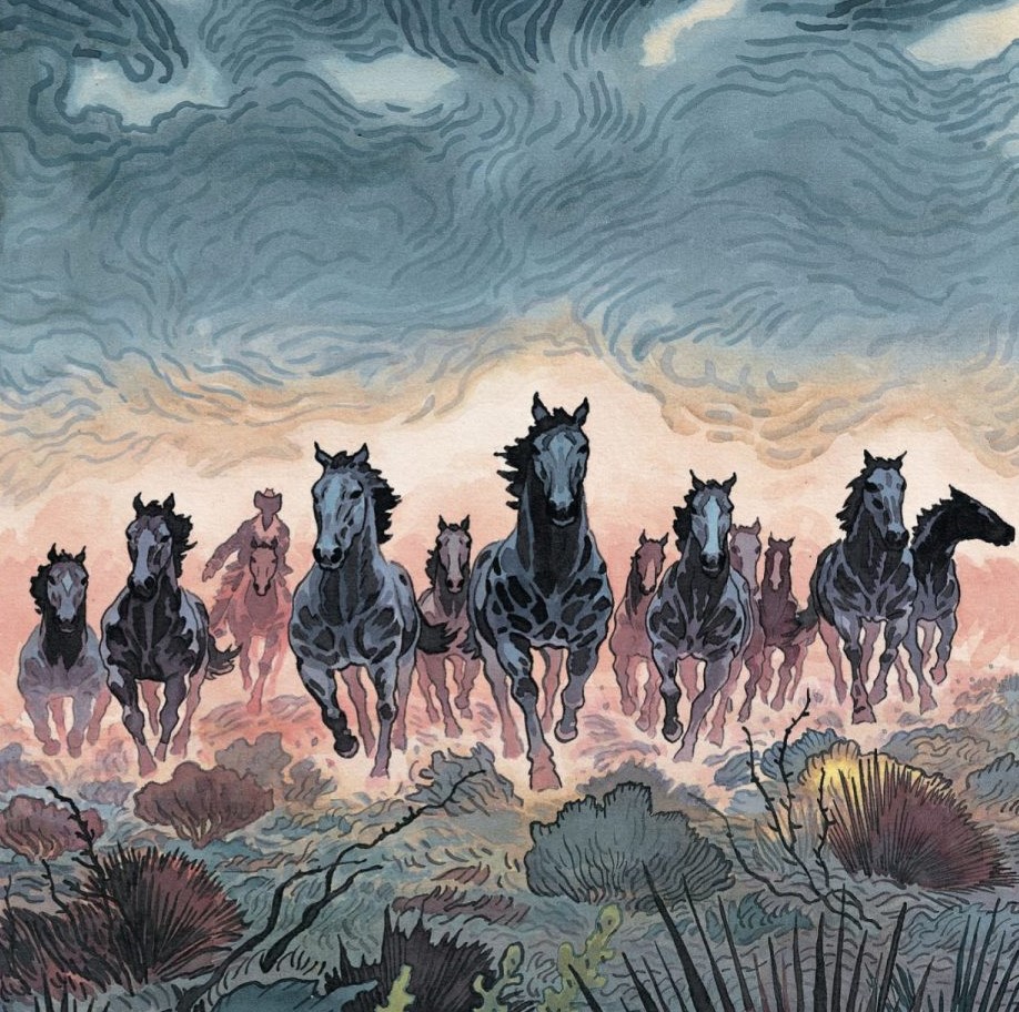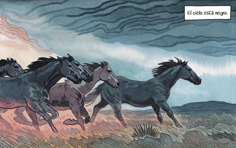 Aquí entra en juego el dibujo, que es, sin exagerar, uno de los puntos más potentes del comic. Anthony Pastor se aleja de un estilo realista clásico para apostar por una aproximación mucho más pictórica y expresiva. Hay algo de pintura en cada página, algo que recuerda por momentos a ciertos autores posimpresionistas en el uso del color y en la manera en que los fondos parecen vibrar, retorcerse o incluso “respirar”. El color es fundamental para entender el tono de la historia. Los naranjas y marrones intensos dominan las escenas diurnas, casi quemando la vista, transmitiendo calor, polvo y una sensación constante de incomodidad. Las noches, en cambio, se tiñen de azules y violetas densos, pesados, como si la oscuridad tuviera peso propio. En otros momentos aparecen verdes y amarillos más apagados, polvorientos, que refuerzan esa idea de un mundo agotado, seco, al borde de algo que no termina de romper pero que todos saben que va a hacerlo.