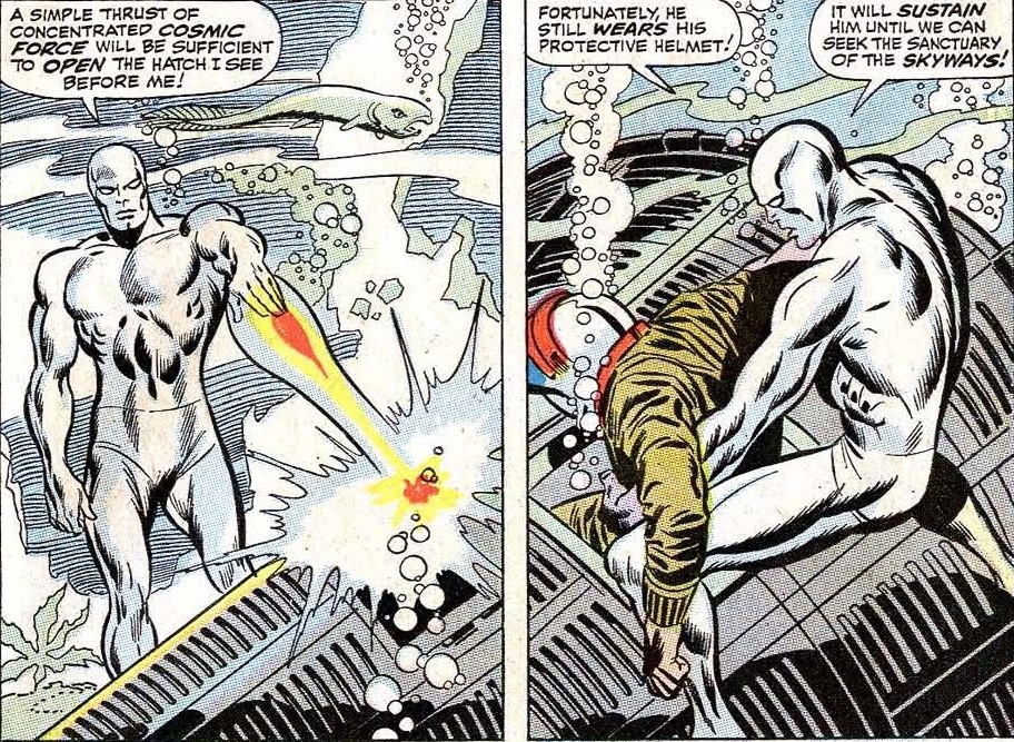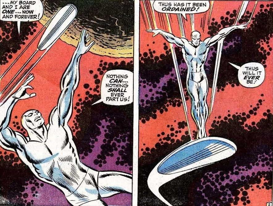 La propuesta arranca en Zenn-La, ese planeta perfecto donde Norrin Radd vivía feliz, enamorado de Shalla-Bal y rodeado de una civilización tan avanzada que el conflicto parecía un concepto obsoleto. Todo es armonía, belleza y progreso hasta que aparece Galactus con hambre. Aquí empieza la grandeza del asunto. Norrin no vence al devorador de mundos, no lo engaña, no lo derrota con ingenio. Se sacrifica. Se ofrece como heraldo para salvar su planeta. Se convierte en Estela Plateada y acepta una eternidad buscando mundos para que su nuevo amo los consuma. Este origen, narrado con solemnidad operística por Stan Lee, es puro melodrama cósmico del bueno, del que no tiene miedo a sonar grandilocuente. Pero lo interesante es que, incluso dentro de esa exageración sesentera, hay una conversación fascinante entre Norrin y Galactus. No son enemigo y víctima al uso, sino dos seres atrapados por su naturaleza. Galactus necesita devorar mundos. Norrin necesita salvar a los suyos. Ambos entienden el peso de su decisión. Ese matiz convierte el arranque en algo más que un simple relato de origen.