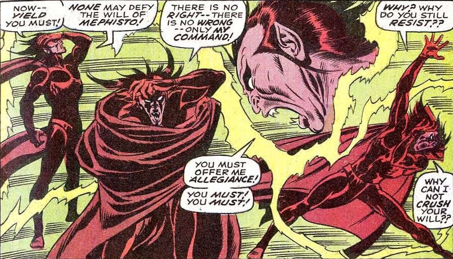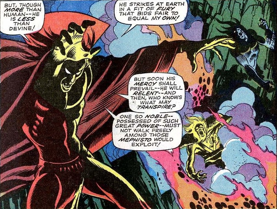 En estos primeros números también asistimos a la irrupción de un personaje que con el tiempo se convertiría en pieza clave del Universo Marvel: Mefisto. Su aparición es pura teatralidad demoníaca, un villano que entiende que la mejor forma de atacar a Estela no es con fuerza bruta sino con manipulación del alma. Utiliza el amor entre Norrin y Shalla-Bal como arma, y en ese juego perverso la serie alcanza algunos de sus momentos más potentes. No es solo un enfrentamiento físico; es una batalla moral, casi espiritual. Y ahí es donde la colección demuestra que no quiere limitarse a ser “otra serie cósmica”.