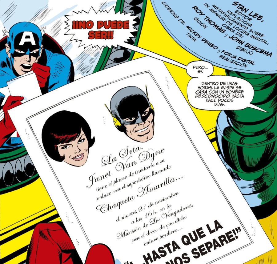 Imagínate abrir un cómic y que lo primero que te encuentres no sea una pelea, ni una invasión alienígena, ni un monólogo existencial bajo la lluvia sino una invitación de boda. Y no una cualquiera, claro: la de la Avispa y Chaqueta Amarilla, con la Mansión de los Vengadores como escenario y medio universo superheroico haciendo cola para felicitar a los novios o para arruinarles el día. Así arranca la locura maravillosa que es esta Biblioteca Marvel de Los Vengadores. Un tomo que reúne The Avengers #60-65 y que demuestra que en la Marvel clásica cada acontecimiento social podía convertirse, en cuestión de páginas, en una guerra total con rayos, discursos grandilocuentes y drama a chorros. Porque estos seis números no son solo una etapa más. Es un camino pedregoso donde el amor, el apocalipsis, los cambios de identidad y los regresos inesperados conviven sin pedir permiso. Todo con ese sabor inconfundible de finales de los sesenta, cuando los héroes hablaban como si cada frase fuera a quedar grabada en mármol y cada amenaza tuviera el volumen de una ópera cósmica. Aquí no se viene a susurrar. Se viene a vivirlo todo a lo grande.