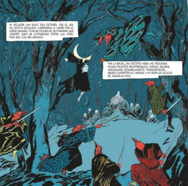 La edición de Tengu facilita este tipo de lectura. Los márgenes no son meramente funcionales: dejan espacio para que la mente del lector complete lo que las viñetas sugieren, para que las palabras respiren. Los títulos de capítulos, la tipografía, la reproducción de los colores. Todo apunta a una obra que no se desplaza rápido, sino que se asienta en la memoria. Este segundo volumen de «Leyendas de los Otori» actúa como la antesala de una tragedia anunciada. No hay grandes explosiones emocionales, sino una presión constante, casi asfixiante, que se acumula página tras página. El amor entre Takeo y Kaede no se vive como un refugio, sino como una herida abierta que ninguno puede permitirse mostrar. Y en esa represión late la verdadera fuerza del relato. En lo que no se dice, en lo que no se hace, en lo que se sacrifica antes incluso de haberlo poseído.
