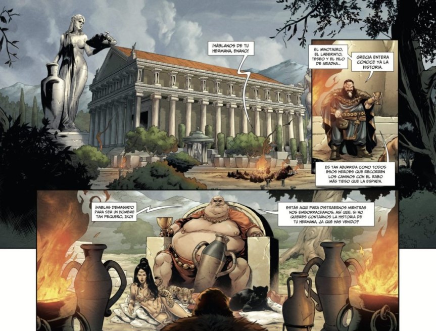 Lo más interesante de este volumen no es solo su épica, sino su lectura política del mito. La serie no es sutil en su mensaje. Durante siglos, los relatos clásicos glorificaron a héroes masculinos y relegaron a las mujeres a papeles secundarios como la traicionada, la hechicera, la esposa fiel o la loca vengativa. Aquí, en cambio, los hombres suelen aparecer debilitados, confundidos o moralmente ambiguos. No se trata de invertir la opresión, sino de desmontar la narrativa. Ariadna ya no es “la que ayudó a Teseo”. Es la mujer que desafió al inframundo. Irenis no es “la guerrera derrotada”. Es quien se levanta cuando su mundo la expulsa. La guerra primigenia entre dioses y titanes funciona como telón de fondo simbólico. La vieja generación contra la nueva, el orden impuesto contra la rebelión inevitable. Las protagonistas no solo combaten a los dioses; cuestionan el sistema entero.