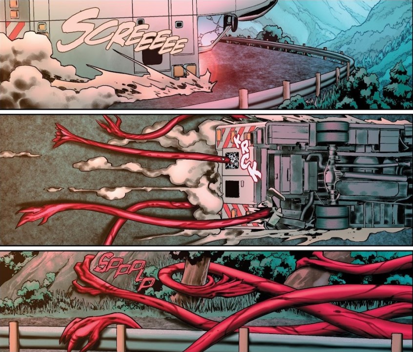 Pero si el guion establece el tono oscuro de la historia, el apartado gráfico es el que realmente la convierte en una experiencia visceral. El trabajo de Jesús Saiz y Juanan Ramírez en el dibujo aporta una atmósfera enfermiza que encaja perfectamente con el deterioro físico y psicológico del protagonista. Eddie aparece constantemente agotado, pálido y al borde del colapso, como si cada paso fuera un esfuerzo titánico. Sus expresiones transmiten dolor y desesperación, reforzando la sensación de que el personaje está caminando literalmente hacia su propia tumba. Por otro lado, Matanza se representa como una criatura en constante mutación. Sus formas cambian, se estiran y se retuercen con una libertad visual que recuerda más a un organismo vivo que a un simple traje alienígena. En algunas escenas adopta configuraciones realmente perturbadoras, desarrollando patas similares a las de un insecto o extendiendo tentáculos que conectan con Eddie mediante una especie de cordón umbilical. Estas decisiones visuales refuerzan la idea de que el vínculo entre ambos es cada vez más profundo y antinatural. Uno de los aspectos más interesantes del dibujo es la forma en que se utiliza el cuerpo de Eddie como campo de batalla. El simbionte se despliega, se retira, se estira y se contrae alrededor de él como si fuera una extensión de su sistema nervioso. Esto refuerza la idea central de la serie: Eddie y Matanza ya no son dos entidades separadas, sino una relación simbiótica que se vuelve cada vez más difícil de controlar. El color también juega un papel clave en la atmósfera del cómic. Matt Hollingsworth y Erick Arciniega utilizan una paleta oscura y saturada que potencia el tono opresivo de la narración. Los rojos del simbionte contrastan con los tonos enfermizos de la piel de Eddie, creando una sensación constante de peligro y decadencia. Cada escena parece impregnada de una tensión latente que estalla en cuanto aparece la violencia.