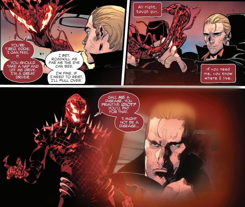 Hay viajes por carretera que cambian tu vida. Otros que te ayudan a encontrarte a ti mismo. Y luego está el viaje que se propone en el tercer tomo de «Eddie Brock: Matanza». Un recorrido salvaje por carreteras secundarias, pueblos polvorientos y decisiones morales podridas en el que el protagonista no busca iluminación espiritual, sino algo mucho más básico: sobrevivir matando. Este tercer tomo, que recopila los números finales de la serie publicados por Marvel Comics y editados en España por Panini Comics, pone punto final a una historia tan incómoda como fascinante. Porque cuando uno se llama Eddie Brock y comparte cuerpo con la criatura más psicópata del universo Marvel, lo normal es que cualquier intento de redención acabe convertido en una carnicería.