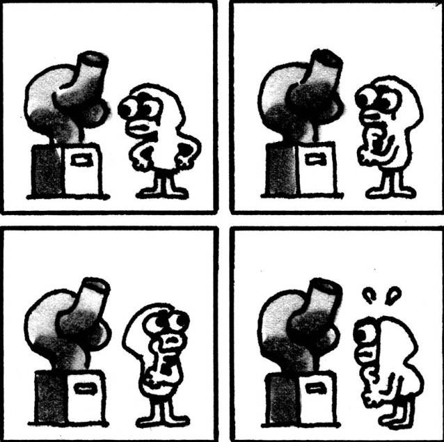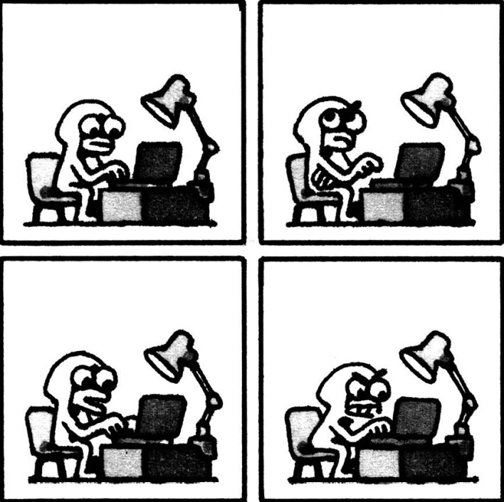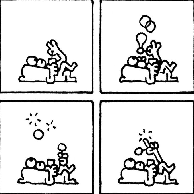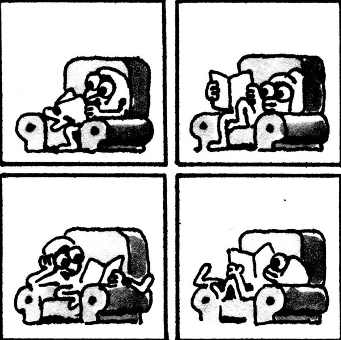 Durante todo el tebeo no hay ni una sola palabra. Ni diálogos, ni bocadillos de texto, ni pensamientos en nube. Solo cuatro viñetas cuadradas por página, siempre iguales, siempre en la misma disposición. Una retícula casi obsesiva, tan regular que podría parecer una cuadrícula de cuaderno escolar. Dentro de ella, un personaje sin nombre hace cosas. Cosas normales. Tan normales que dan risa de lo reconocibles. Cocina. Espera. Se aburre. Mira el móvil. Ve la tele. Se echa la siesta o mete una carta en un buzón. Devuelve una prenda al perchero tras comprobar el precio. Patina con más entusiasmo que equilibrio. Sopla pompas de jabón. Se queda quieto. Y en ese quedarse quieto, ocurre el prodigio: sentimos el paso del tiempo.